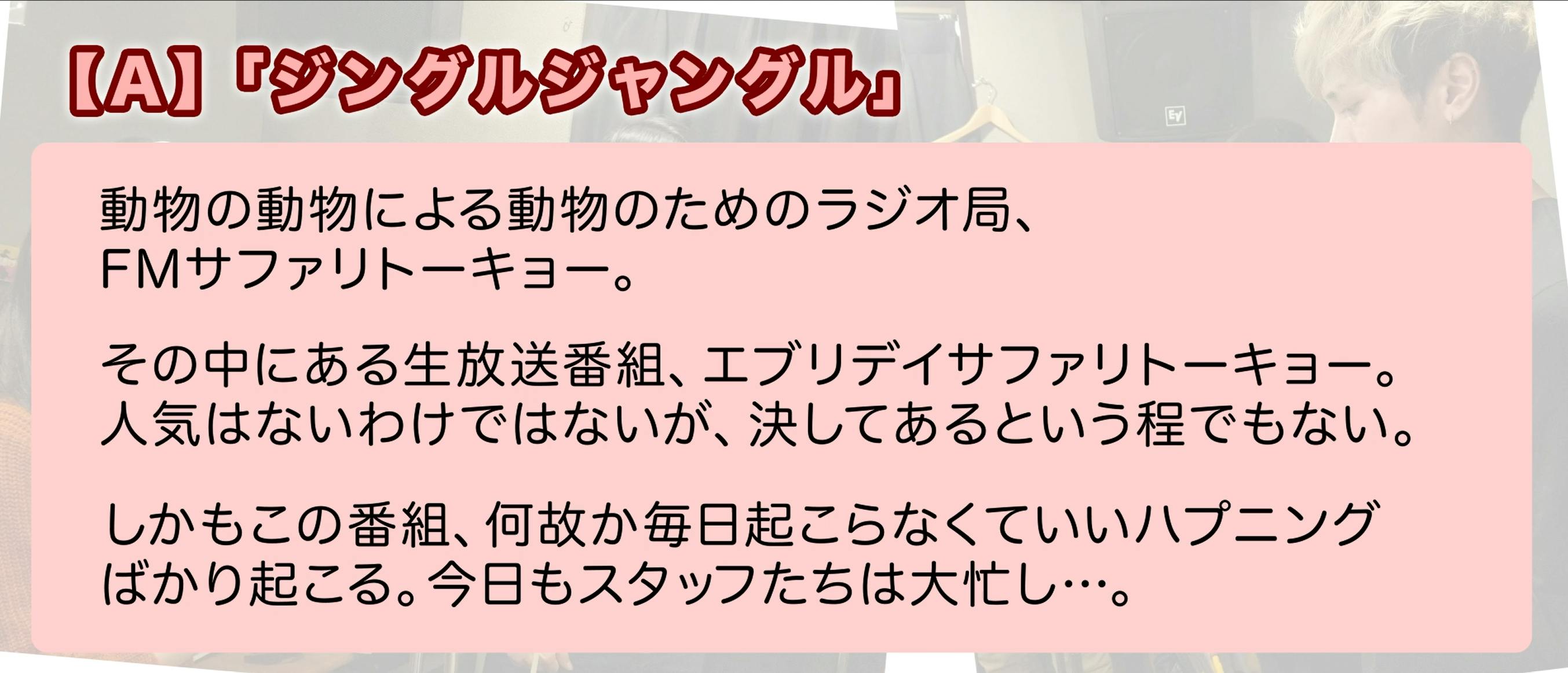 2019/12/01 12:08今年の3月にクラウドファンディングを開始し、今年一年間かけて制作して参りましたラジオドラマ「ジングルジャングル」がついに販売するところまでやってまいりました!!12月1日PM0時より、下記サイトにてデータ販売&CD予約受付を開始いたします。https://hitomizaka.base.shop/販売価格は以下の通りです。各話ダウンロード・・・各話250円4話一括DL・・・1000円CD予約販売・・・1500円+送料そしてそして、CDには佐々木聖也さんに制作していただいた「ジングルジャングル」のメインテーマ”Hello Safari Tokyo”が収録されます!(こちらのトラックのデータ販売はございません。)CDは12月20日順次発送予定ですので、予約販売とさせていただきます。CDジャケットは眼球クッキー研究所の目目目ちゃんさんに書きおろして頂きました!また、クラウドファンディングの発送は12月中旬を予定しておりますので、ご支援頂きました皆様は今しばらくお待ちください。それでは、皆様のご利用、心よりお待ちしております! もっと見るジングルジャングル3、4話公開!