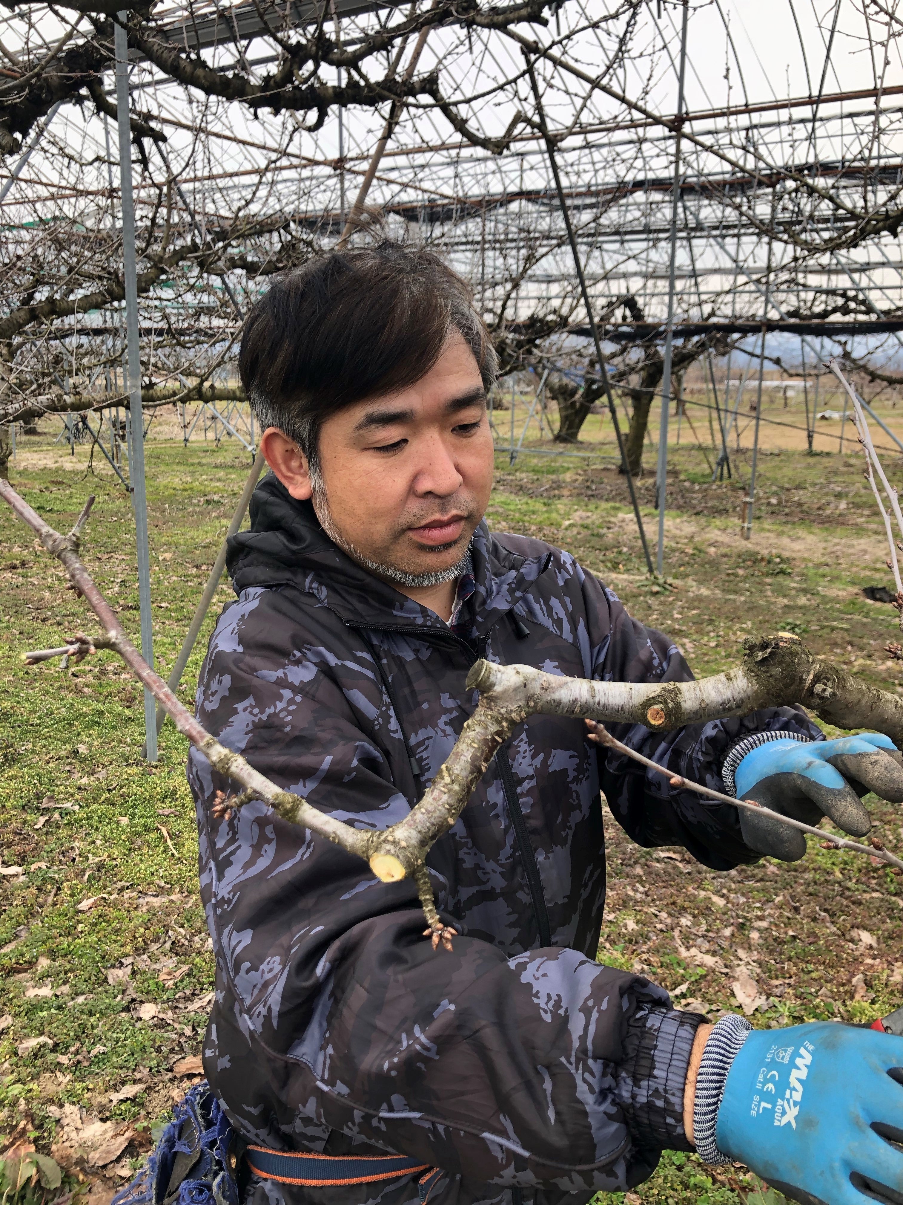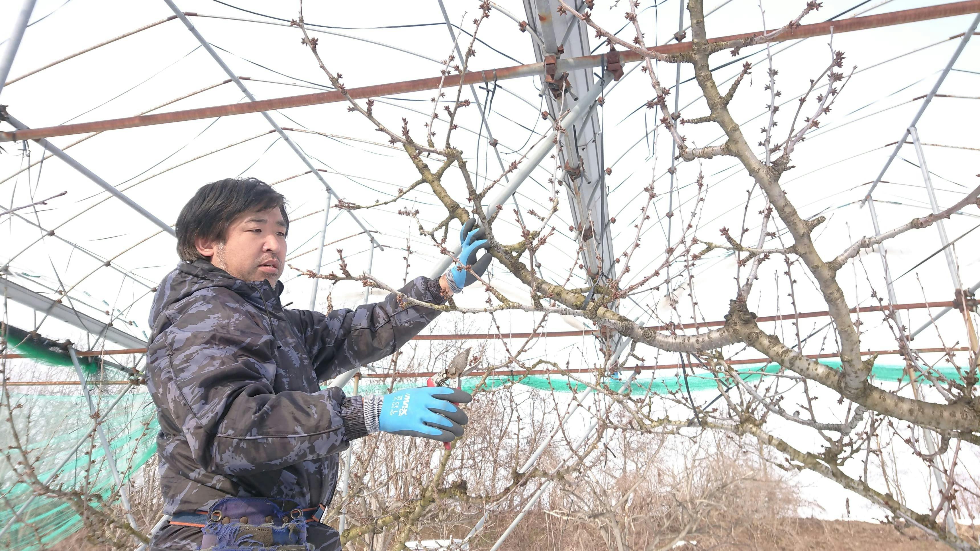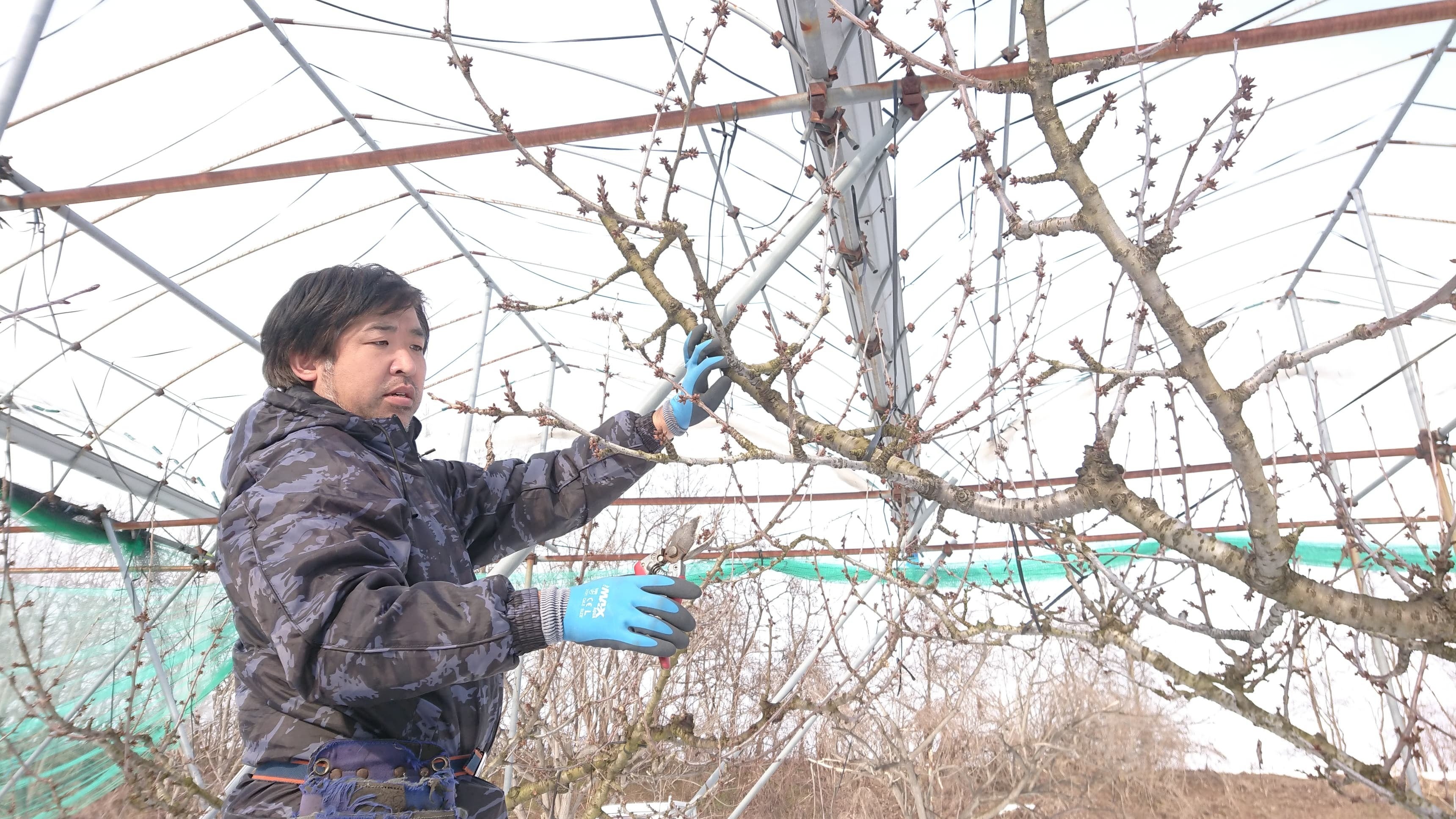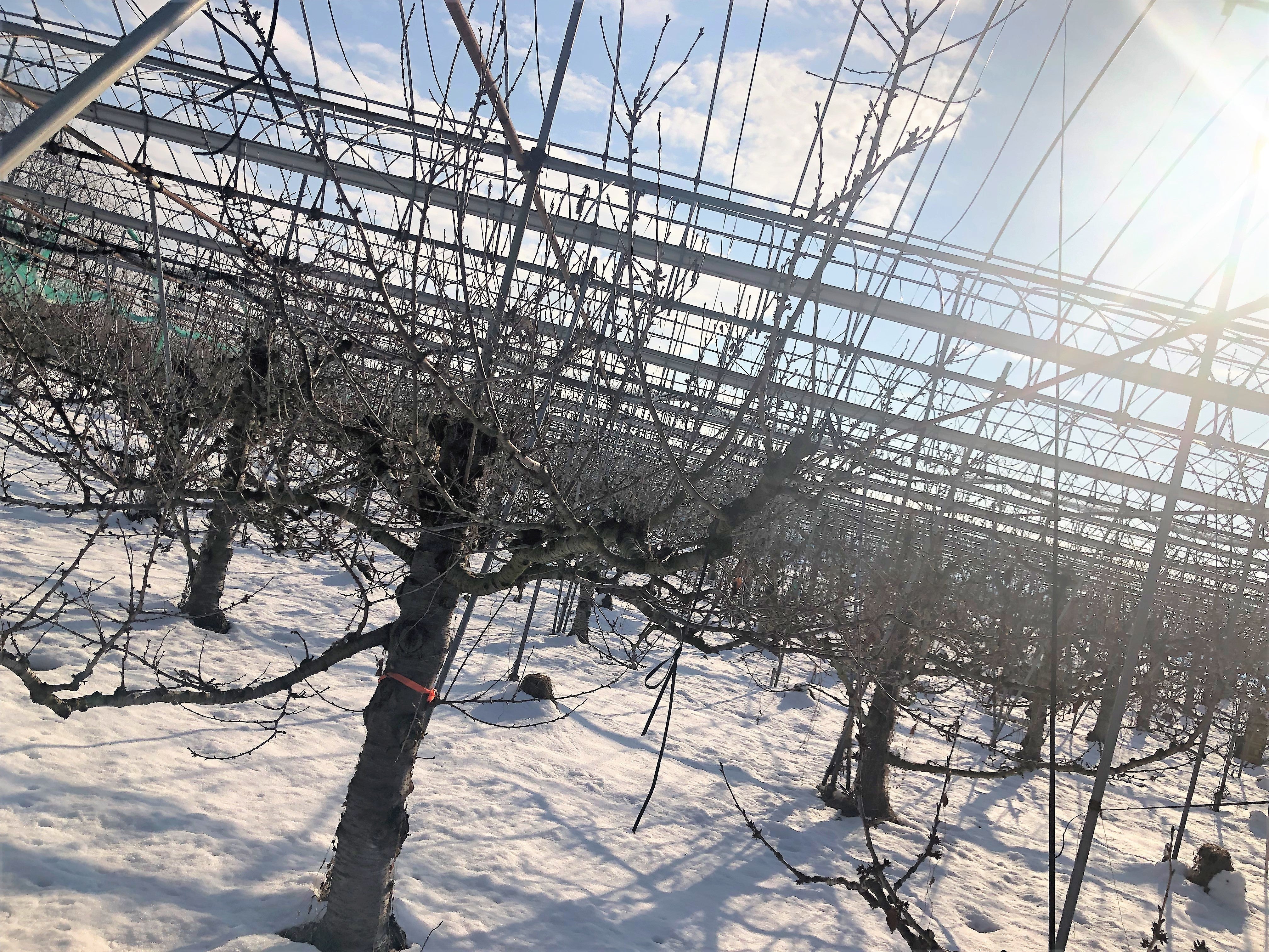 次に、厳冬期の雪降る畑の中で枝の成長具合や、枝に着いている花芽の大きさ、木の中で起こる養分の流れなどを見極めながら剪定作業を行っていきます。
