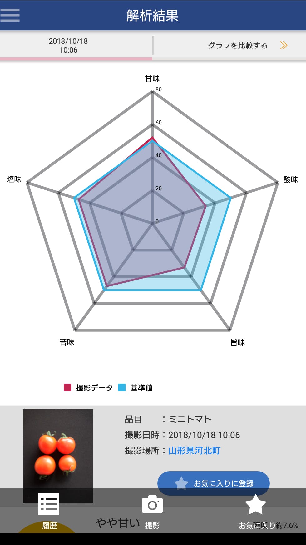 (画像はミニトマトの味の測定サンプルです。実際にお届けするものはさくらんぼの味の測定結果(甘味・酸味・塩味の3要素)を基にした保証書です)