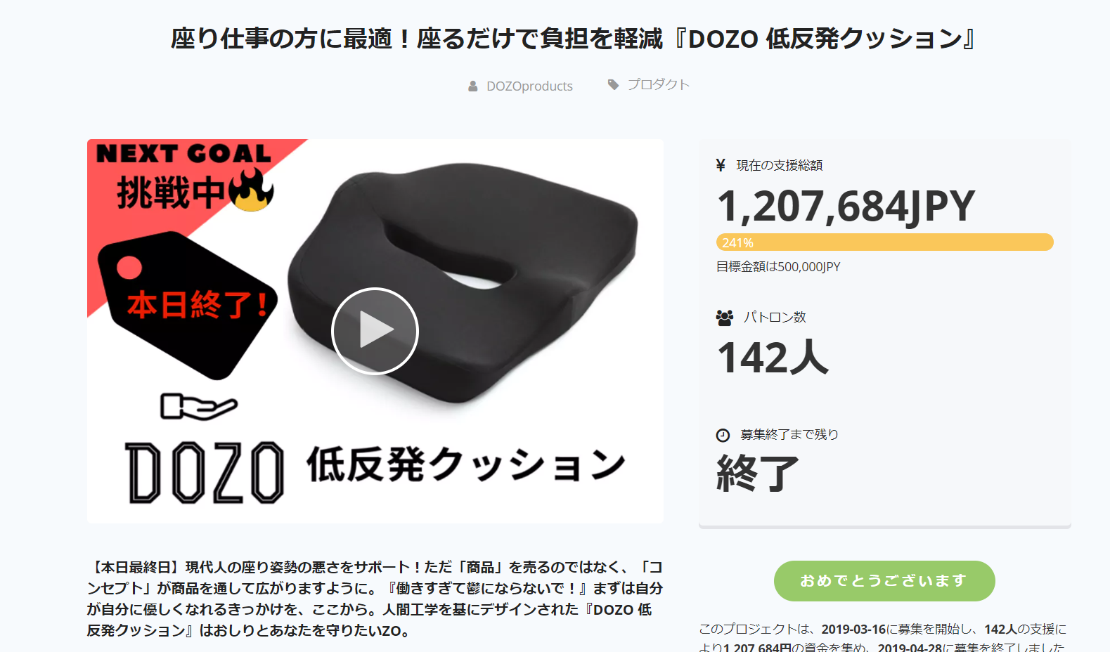 第一号商品「DOZO低反発クッション」をCAMPFIREにて発売開始