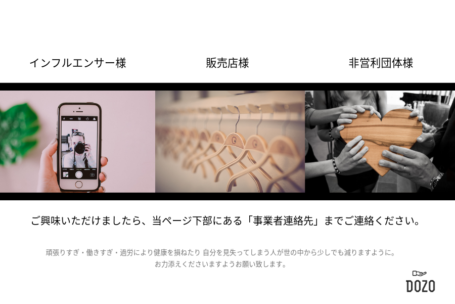 私達DOZOプロダクツは、少しでも何か世の中のお役に立てればと存じております。過労による鬱など、働きすぎて体調を崩してしまった人たちをサポートするなどして活動されている団体様、是非お気軽にご連絡ください。