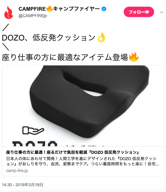 CAMPFIREツイッターにて「DOZO、低反発クッション」がツイートされました。