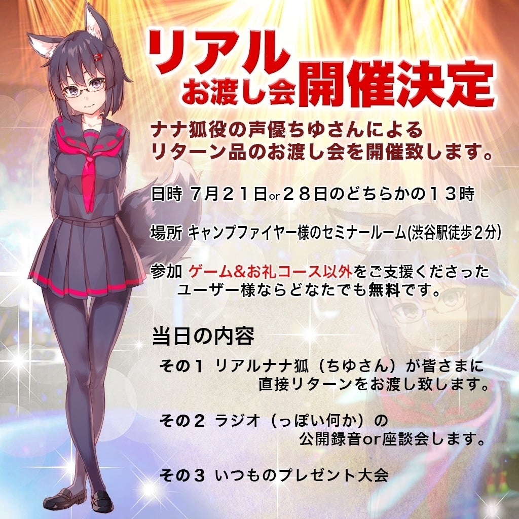 ナナ狐に扮したちゆさん(リアルナナ狐)にリターン品を直接渡して頂けます。