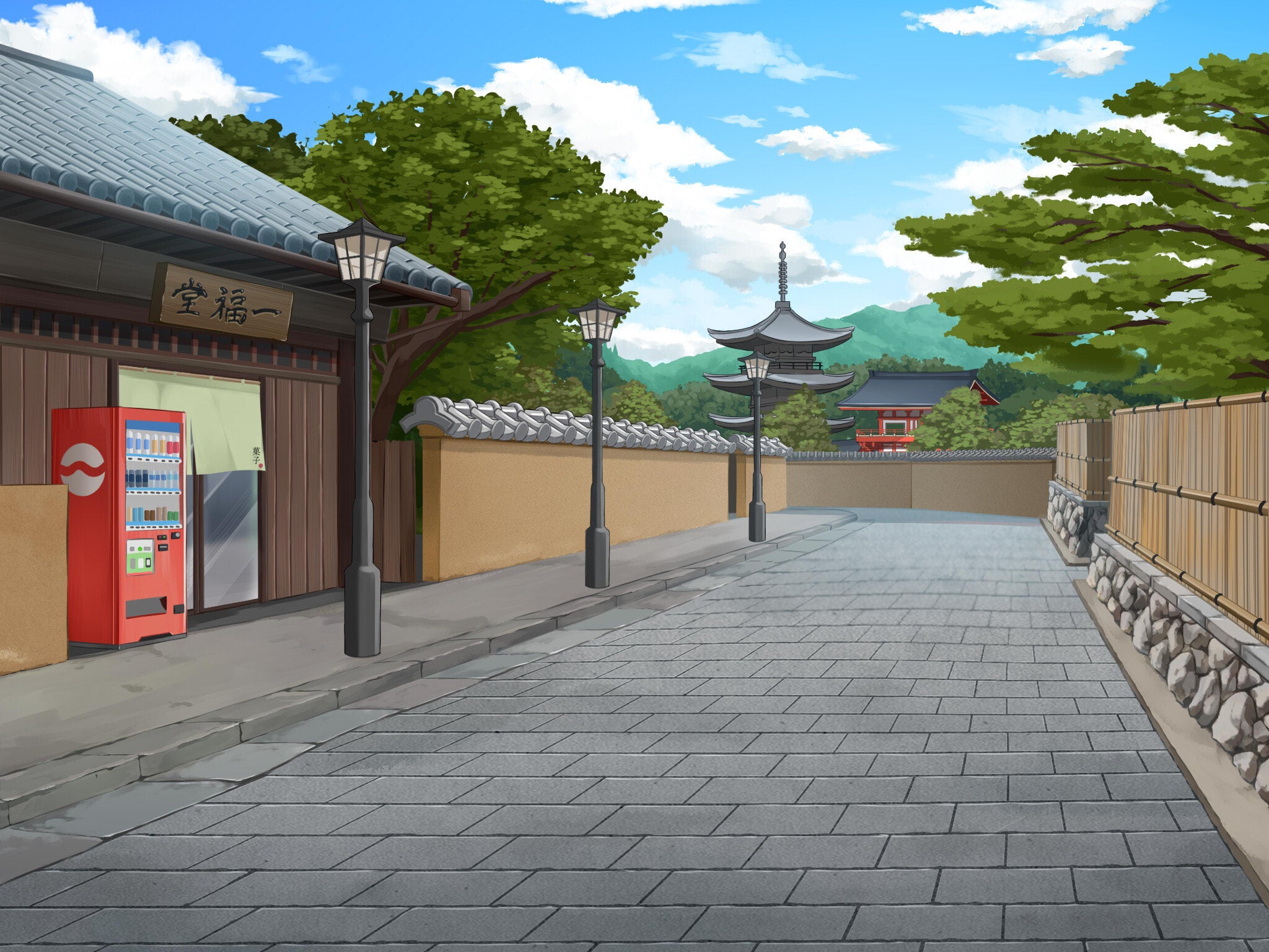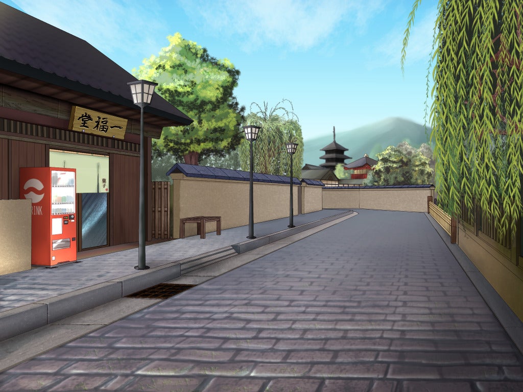 建物や石畳の質感によりリアリティを高め、背景のお寺や雲の描き込みで風情もアップしております。