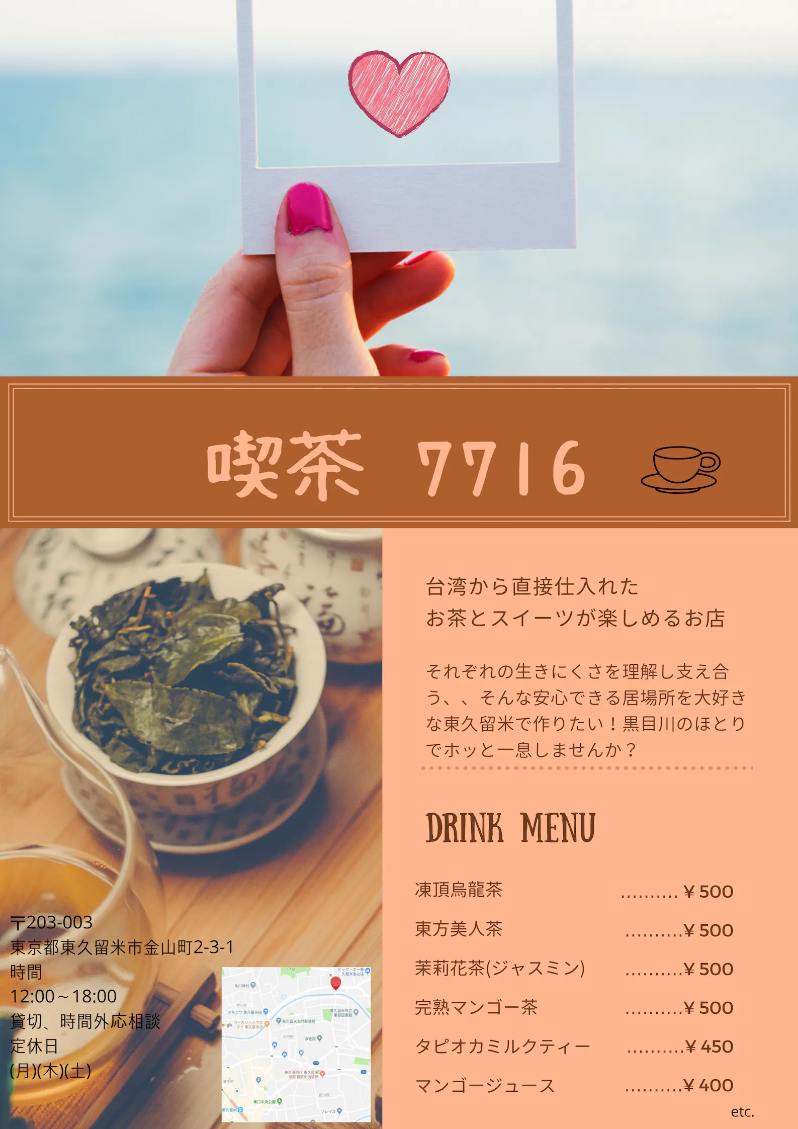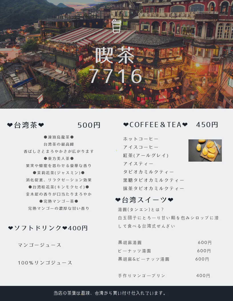 2019.5.15東京都東久留米に、台湾のお茶とスイーツが楽しめる「喫茶 7716」を開業致します。