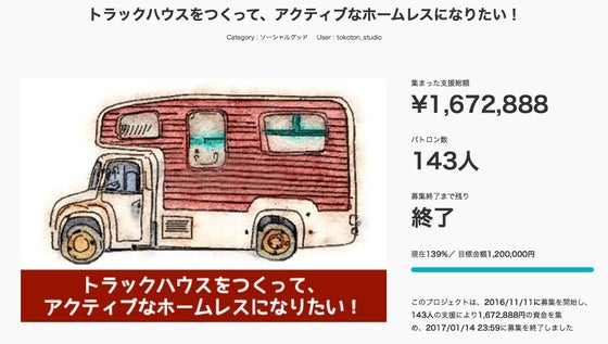 アクティブホームレスへのご支援、ありがとうございました! 目標額を上回り、139%、¥1,672,888で、143人の方に支援していただきました。このほか、直接のリノベーション依頼もあり、本当に感謝しています。これで無事にディーゼル規制対策や廃油仕様にできそうです。 みなさんの気持ちを手に、これから多くの人に貢献していこうと思います。 終了の3日前に、こんなことをFacebookでつぶやきました。 最近、虚空蔵菩薩のようになりたいと思い始めました(おおげさ)。菩薩は、悟りを求めて修行中で、人々と共に歩みながら教えに導く、悟りを開く前の仏様です。 虚空蔵とは宇宙のような無限の知恵と慈悲が収まっている蔵(貯蔵庫)を意味し、人々の願えを叶えるために蔵から取り出して知恵や記憶力、知識を与えてくれるとされています。 虚空蔵菩薩 | 仏像ワールドhttp://www.butuzou-world.com/butuzoumnomiryoku/dictionary/bosastu/kuuzo/ みなさんに支援していただいて完成するトラックハウスは、まさに「虚空蔵」になりそうです。これからの旅で、お会いできるのを楽しみにしています。