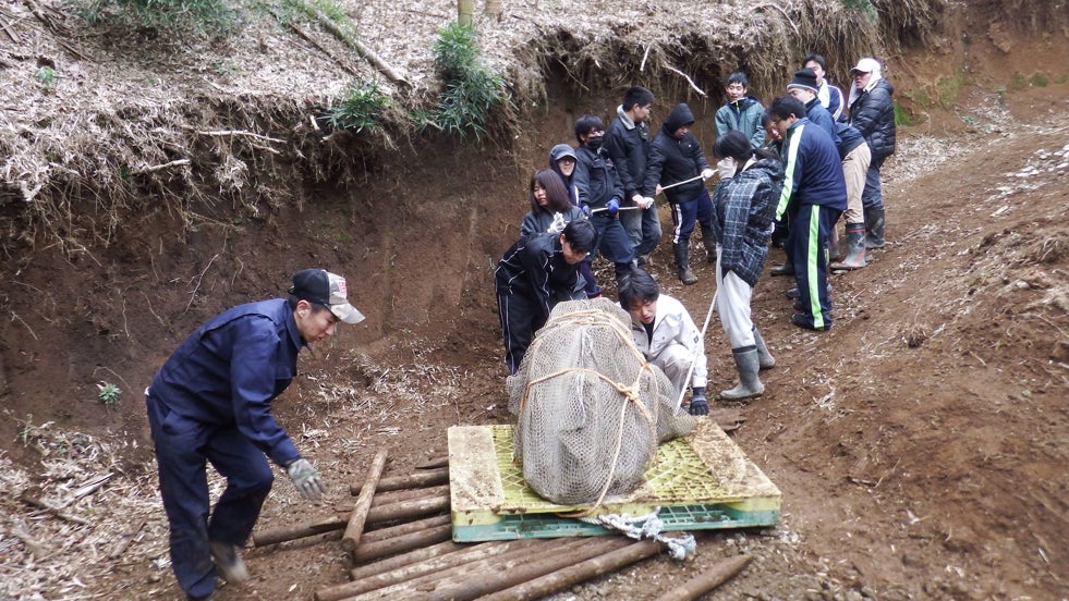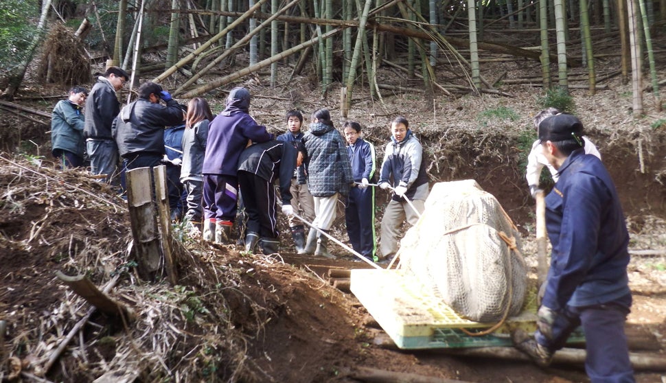 2017年から取り組み、現在、城の基礎作りを行っています。先日、大黒柱の土台となる大岩を人力で運びました。重さ1トン近い大岩を『コロ』と呼ばれる丸太を使い、1kmほどある山のてっぺんまで牽引しました。