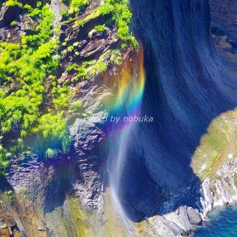 虹に夢中になって気づかなかったのですが、耳をすますと、波の音をかき消すようにサーッという滝の水の音が永遠にこだましています。頬にはほんのりと心地よい潮風を感じます。