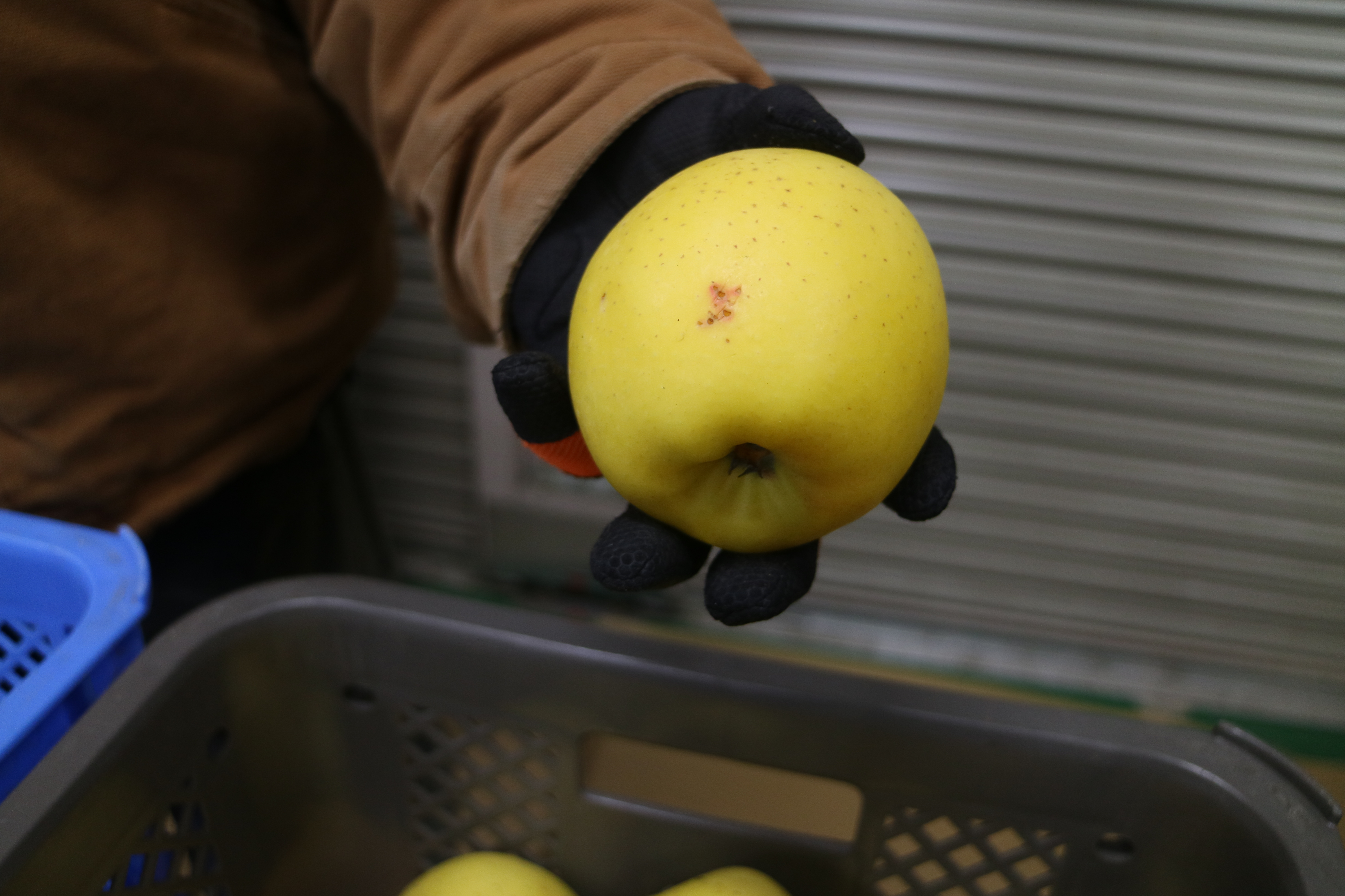 りんごについた小さな傷や凹みを…