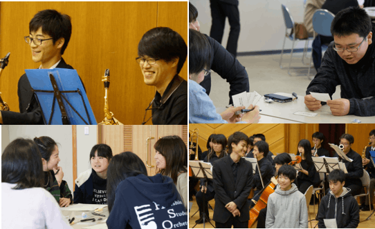 アミオケが京都市右京区京北地域の中高生と、進路・仕事・将来的な地域との関わり方などについて考え合うワークショップを開催し、その後地元の学校歌などを一緒に歌って演奏する企画。日頃いろんな仕事をしながら音楽活動と両立している演奏者たちだからこそできたワークショップでした。この企画は、参加した人びとすべてが自分の持つ価値を再発見できるような出会いとコミュニケーションが生まれるように設計しました。