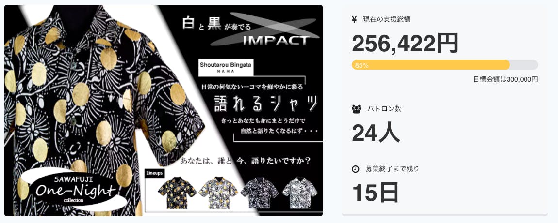 おかげさまで、多くの皆様のご支援、応援により、現在目標金額の85%(総支援額:256,422円 / パトロン数:24名)を達成しております。