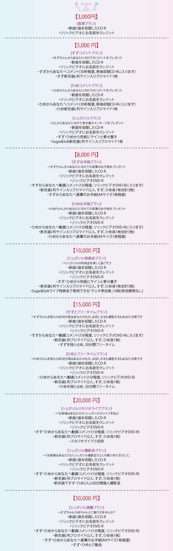 しかしライブを止めることはできません。各地でSugar&Soltを待ってくれている方が増えています。さらにこの夏に活動3周年を迎えるにあたり、よりお客様と楽しく盛り上がれる1曲をどうしても作りたい、それをみんなで作ってみたいとライブを重ねるごとにメンバーと考えるようになりました。今回新曲制作のためにクラウドファンディングに挑戦します。何卒ご支援のほどお願いいたします。