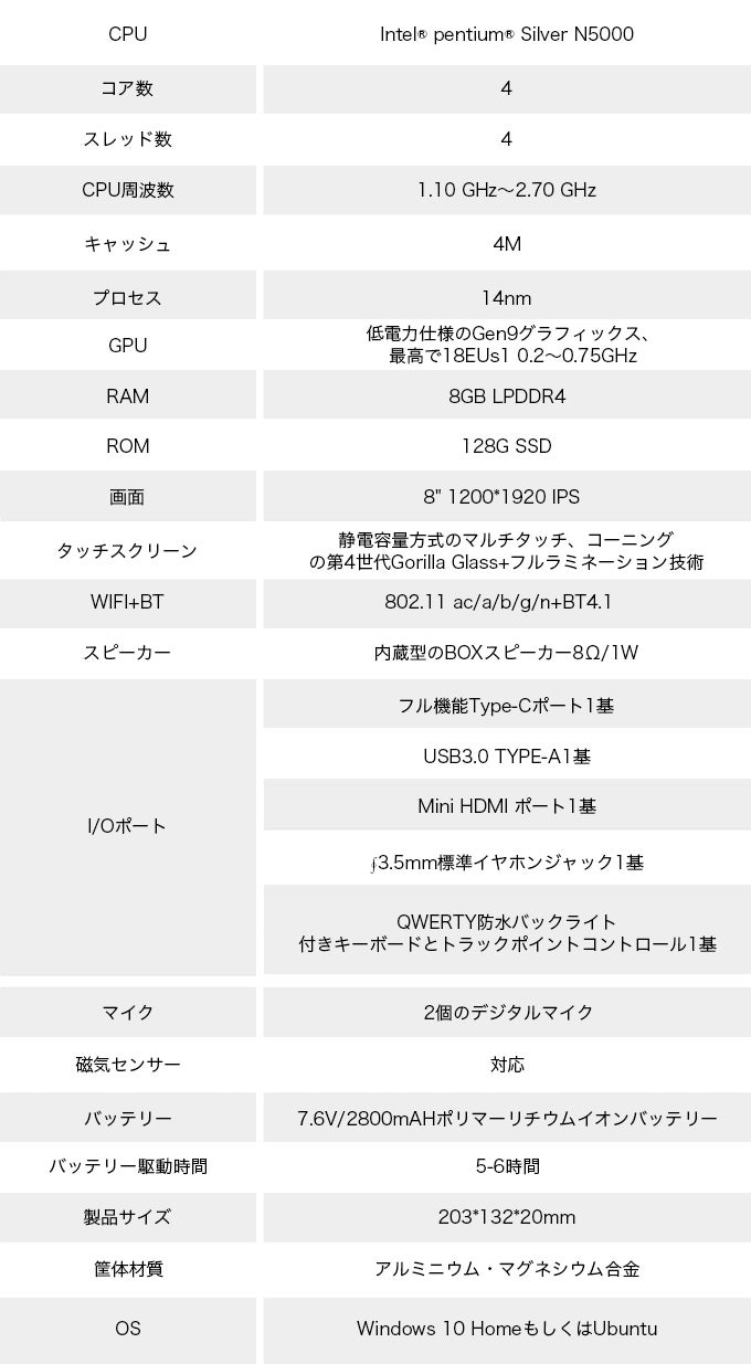 Falconの心臓部には、パワフルなIntel® Pentium® Silver N5000クアッドコアCPUが搭載されており、典型的なアプリケーションであれば、小さいデバイスにありがちなパワー面での問題は心配ありません。8GBのRAMを備え、また最高で256GBのSSDを搭載できるので、ファイルも音楽も動画も思うがままに保存できます。さらに1920 x 1200の解像度のタッチスクリーンはコーニングのGorilla Glassで保護されています。信頼性の高いWindows 10 HomeとUbuntuでの起動が可能です。