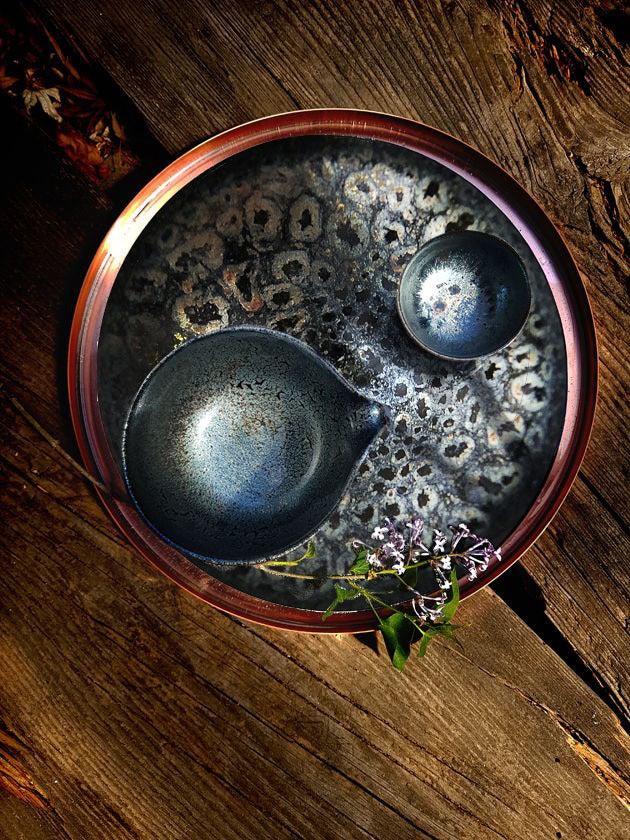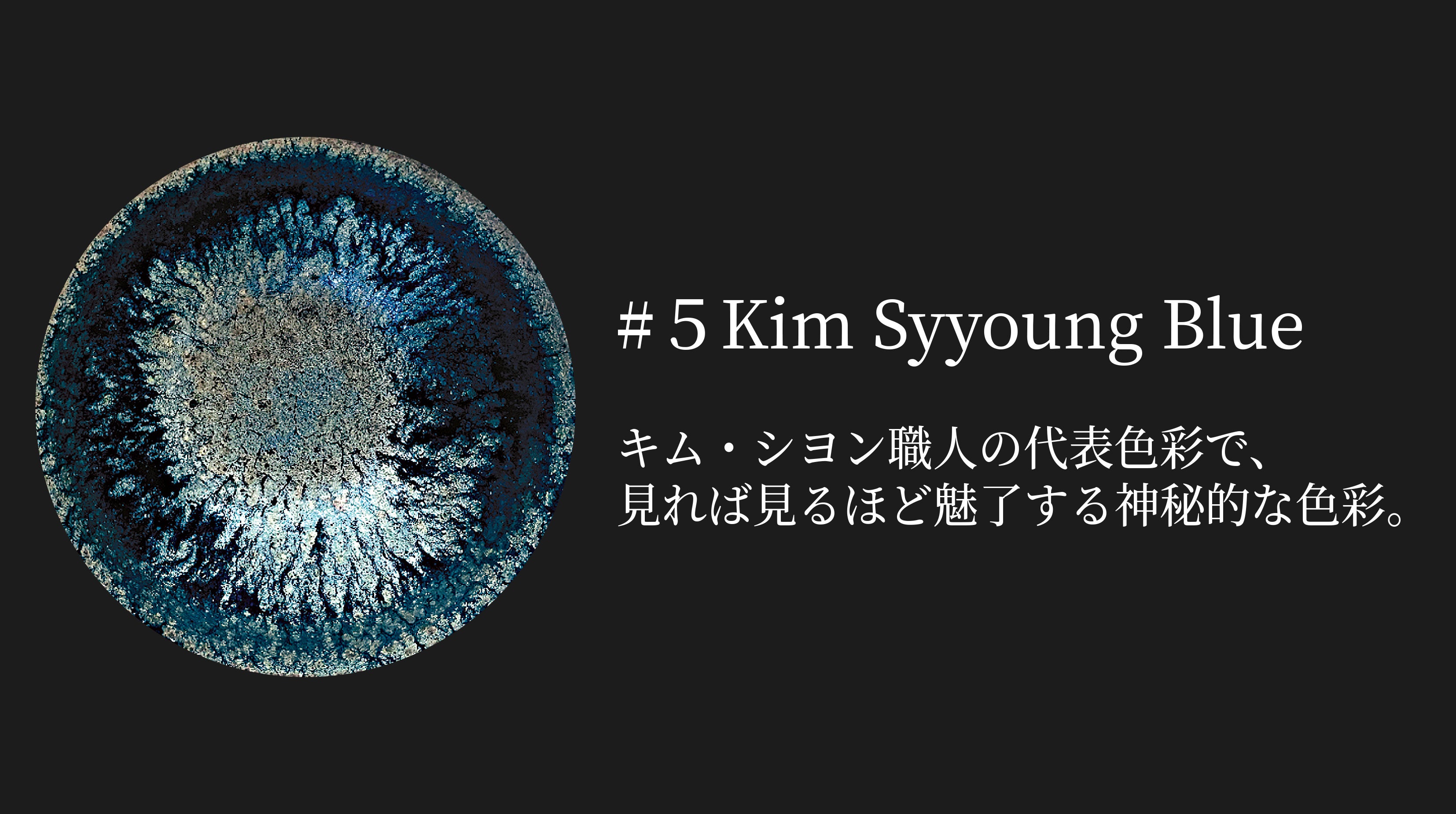 そして、韓国では唯一キム・シヨン職人が「曜変天目」の再現に成功し、歴史を超える独創的な模様と色彩を再現しています。「曜変天目」の二重の斑紋(窯変)はキム・シヨン職人の独自の研究成果であり、青い光と青緑の光、そして、赤い光が多彩深く混じり合っています。そして色彩と模様や大きさ、全てが自由な形に発展されました。花のようなクールで堅い密度のある作品です。