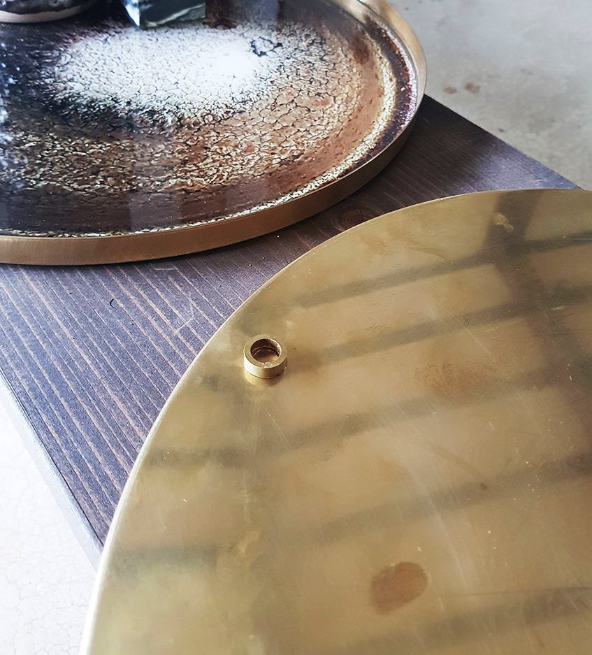 →黄銅の表面に抽象の模様を作るポリッシング作業。