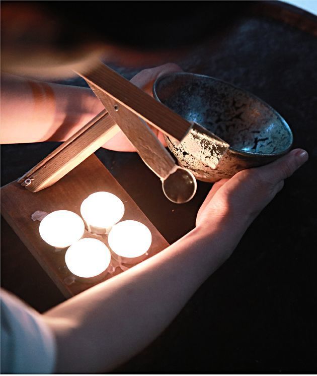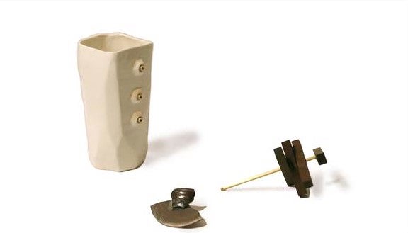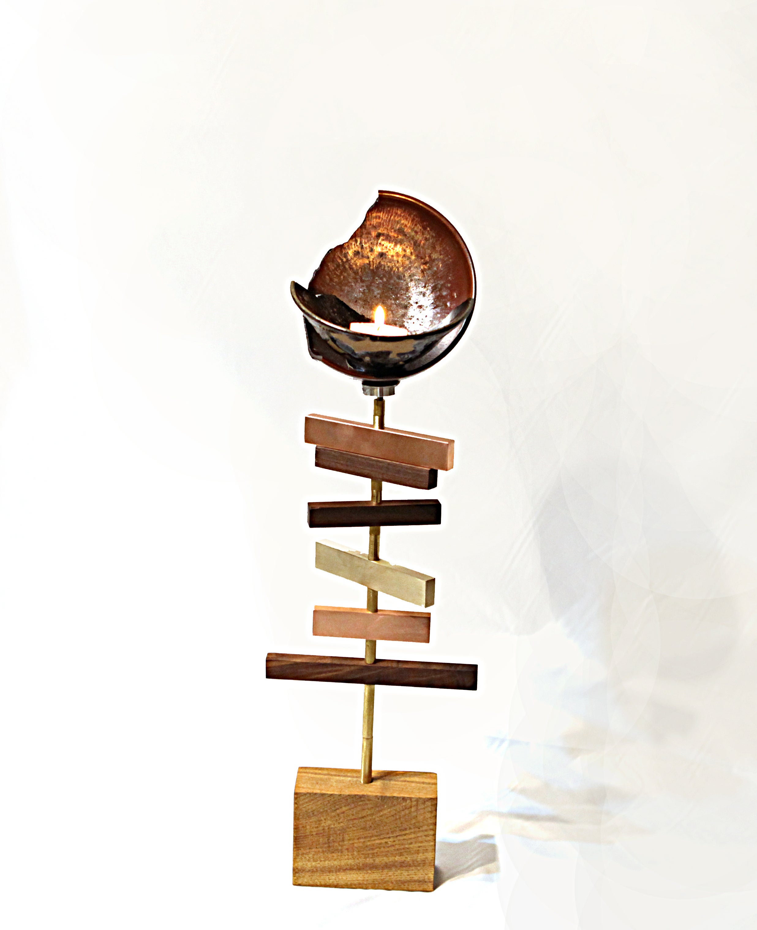 陶片の造形と金属、木、石はモジュール化されており、お客様が必要な部分を簡単に変えて、演出することができます。夜空の輝く神秘的な星のような自分の燭台が作れます。燭台の両端部は、ねじ山が搭載されており、回すと簡単に取り外ができます。