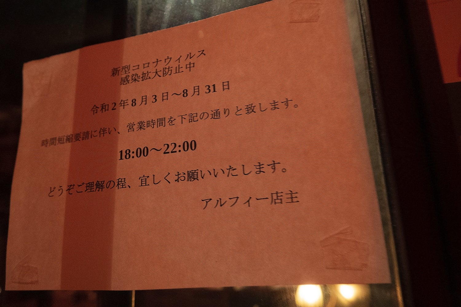 お店の扉に貼ってある8月営業時間のお知らせ
