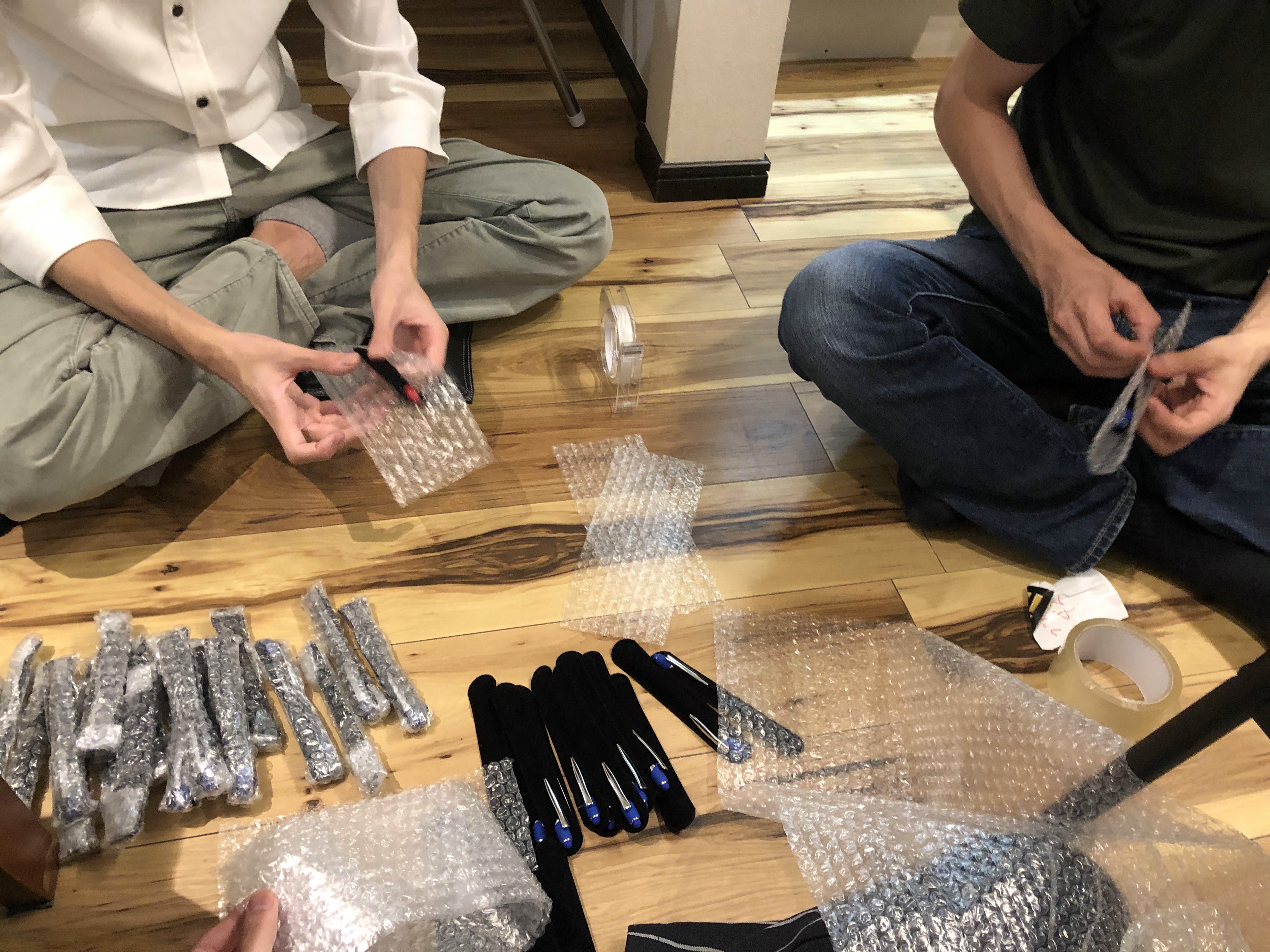 クラウドファンディングの企画終了後、すぐに都内某所にて、ボールペンやスティックなどの梱包と発送を行いました!
