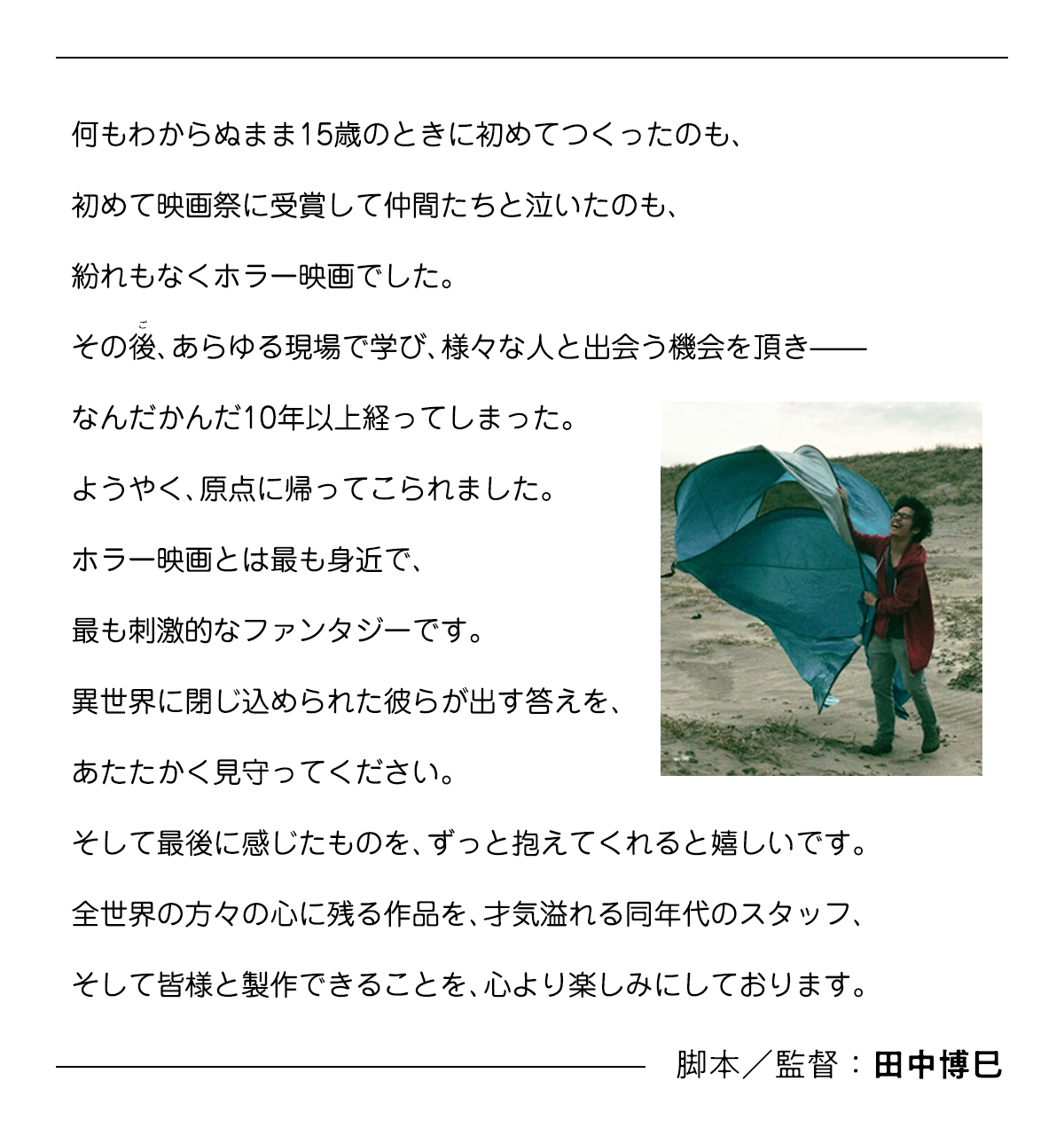 「ヘレディタリー / 継承」「クワイエット・プレイス」「死霊館」など、今ではすっかりハリウッド作品が優勢となってしまった「ホラー映画」。安価で製作する……というイメージすらついてしまったように思えるジャンルですが、あえていま、数億円をかけて長編作品として作るのではなく、もう少しの時間と予算で「短編映画」として製作することにより、重厚かつ濃密な「ホラー映画」を世界に発信したい……というプロジェクトです。監督は16歳で第3回映画甲子園グランプリを受賞し、その後自らのプロダクションでCM・映画を中心に活動し続ける田中博巳。長澤まさみを主演に据え、20世紀フォックス配給での日本映画製作が話題となった『群青 愛が沈んだ海の色』の山田英久がエグゼクティブ・プロデューサーを担います。