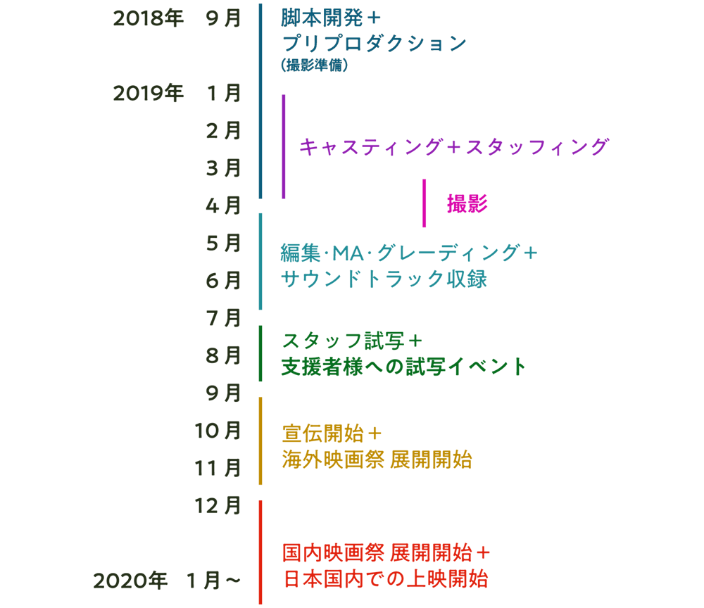 A:主要キャスト3人前後、現場スタッフ25人前後を予定しております。東京・千葉・神奈川で撮影、東京都内でポストプロダクションを行ないます。