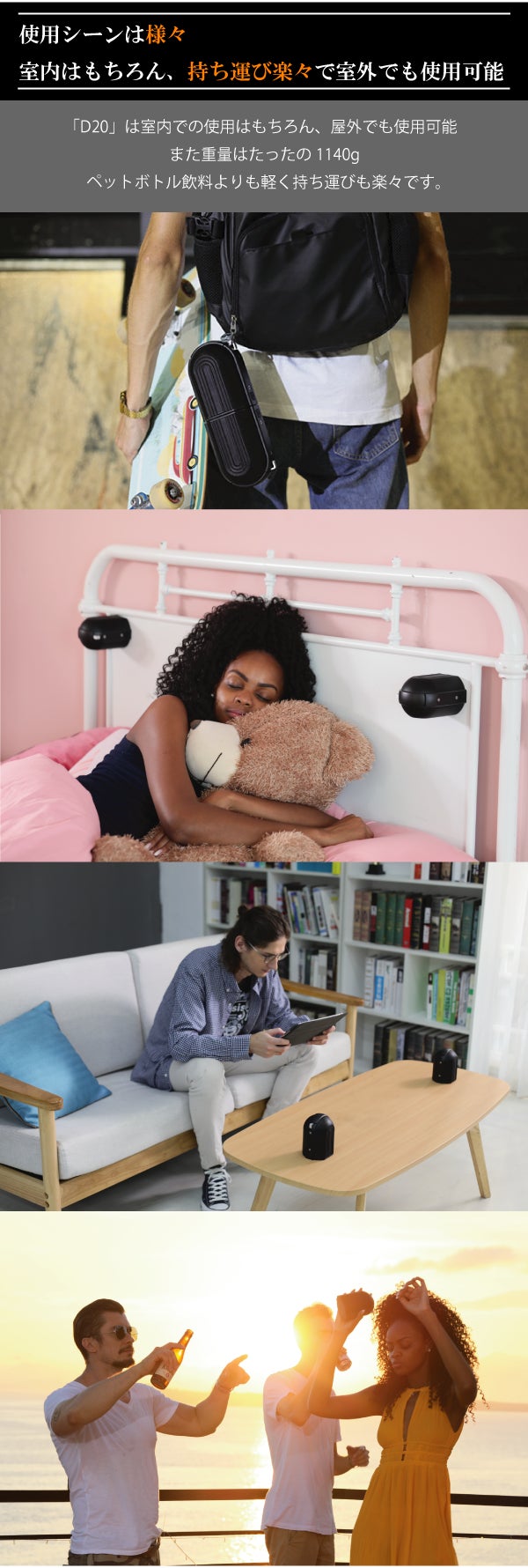 今では多くのワイヤレススピーカーが世界中で流通している中、「D20」は音質という本質的な品質を更に追求し、また新たな付加価値を搭載し皆様の生活の中でワイヤレススピーカーが更に身近になる様再定義する為に開発されました。