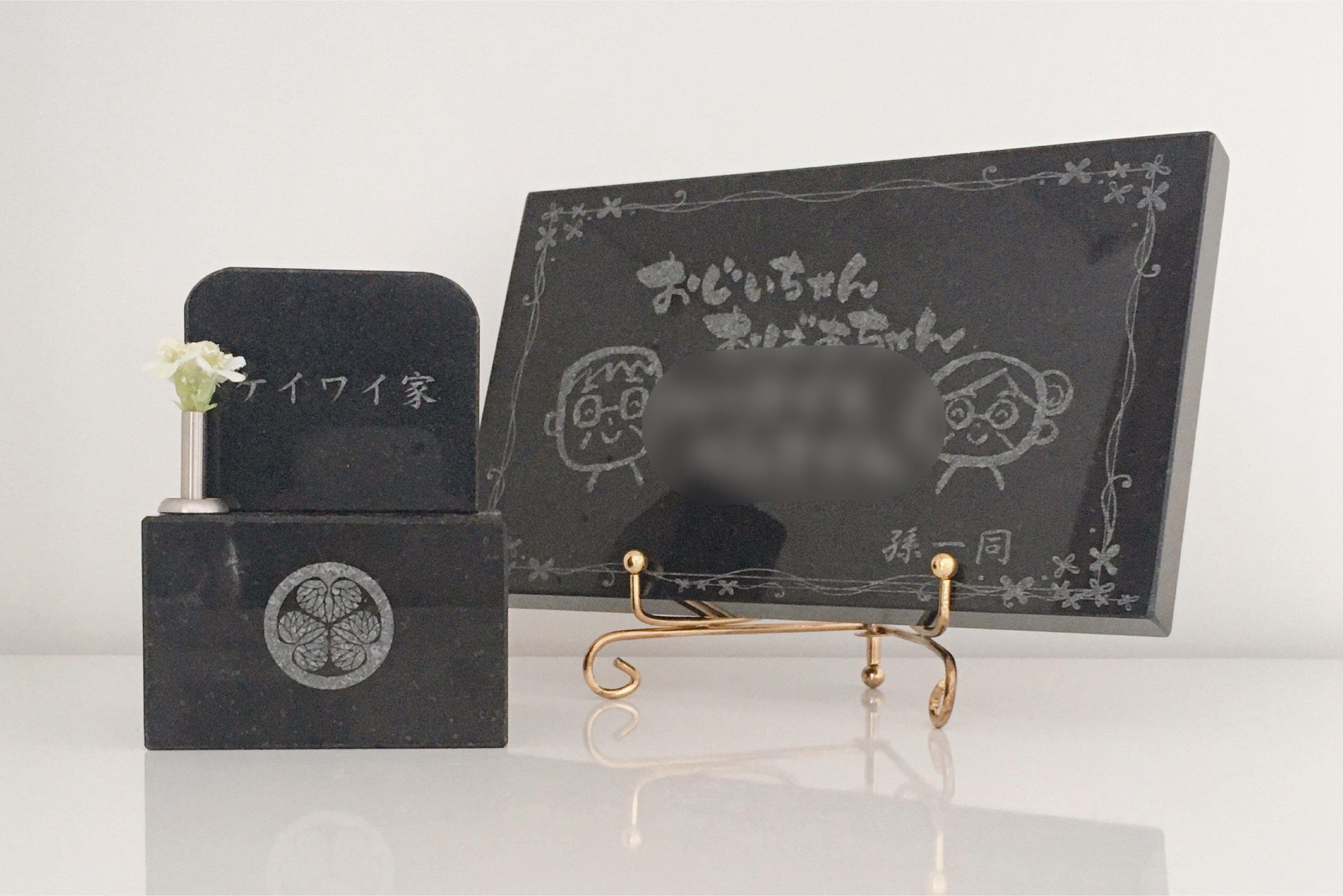 ミニお墓スタンダードタイプは芝台(台座)に彫刻を施す事も。付属のスタンドに立ててメモリアルプレートにする事もできます。※プリザーブドフラワーは別売り