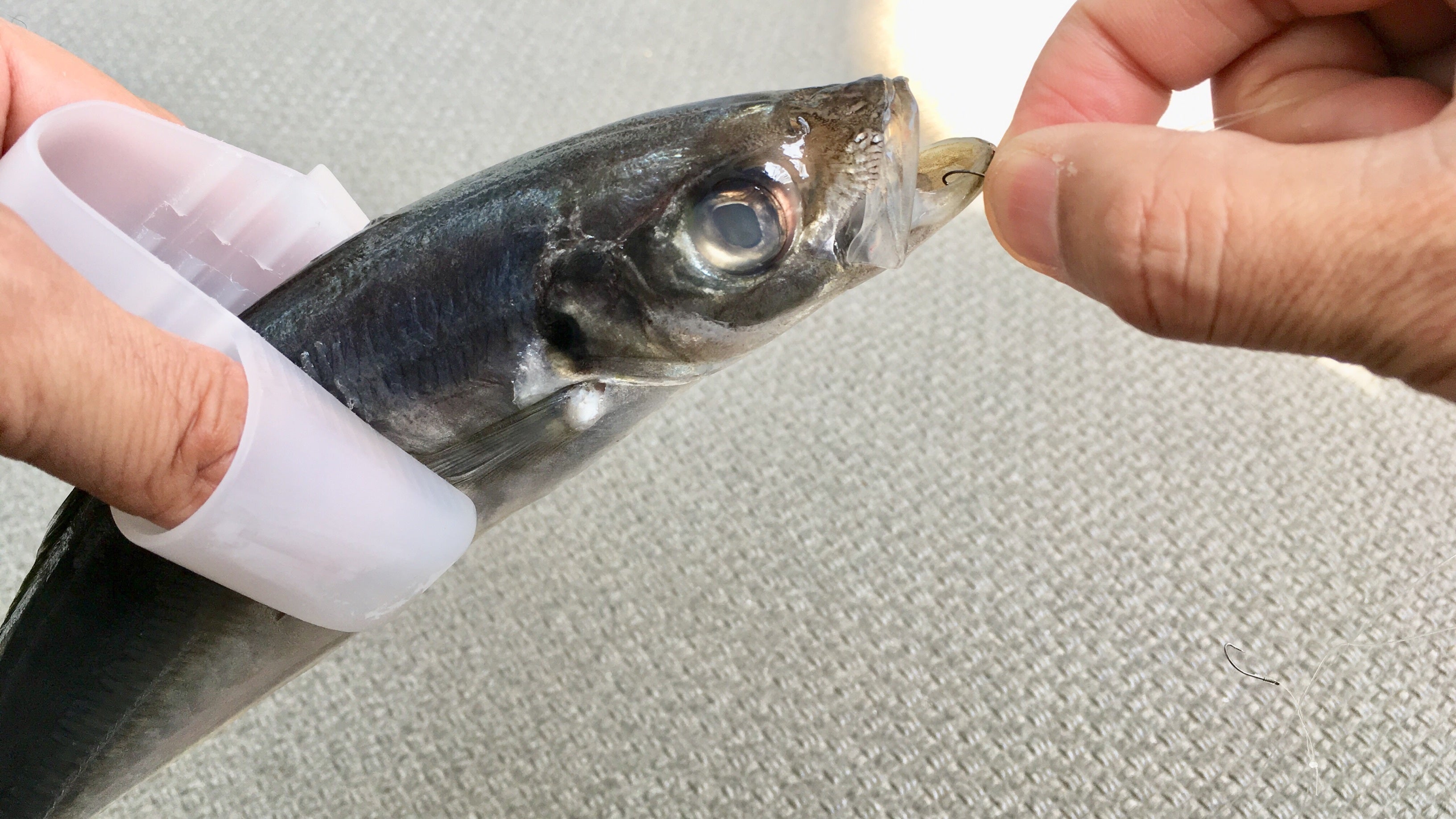 魚をつかむ、毒針を押さえる