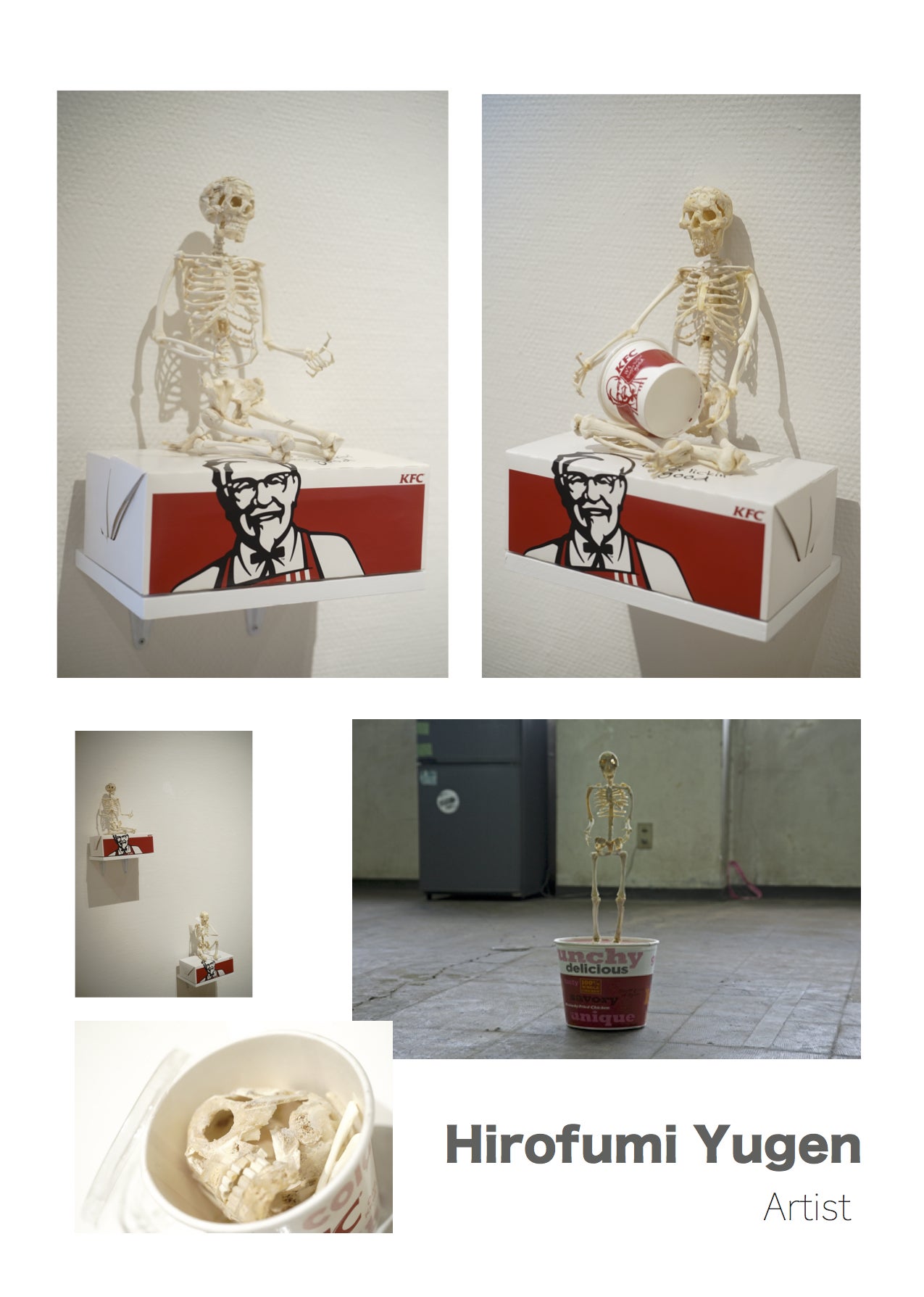 ▶︎祐源紘史1979年岡山県生まれ、2004年にハノーバー専科大学彫刻科(ドイツ)へ交換留学。2006年広島市立大学大学院芸術学研究科造形計画終了。身近な素材にキャラクターなどの具体的な形や意味を与えて再構成し、インスタレーションへと発展させた作風を得意とする。近年では鶏の骨などの残骸を使用して食に言及した作品を発表。広島在住。