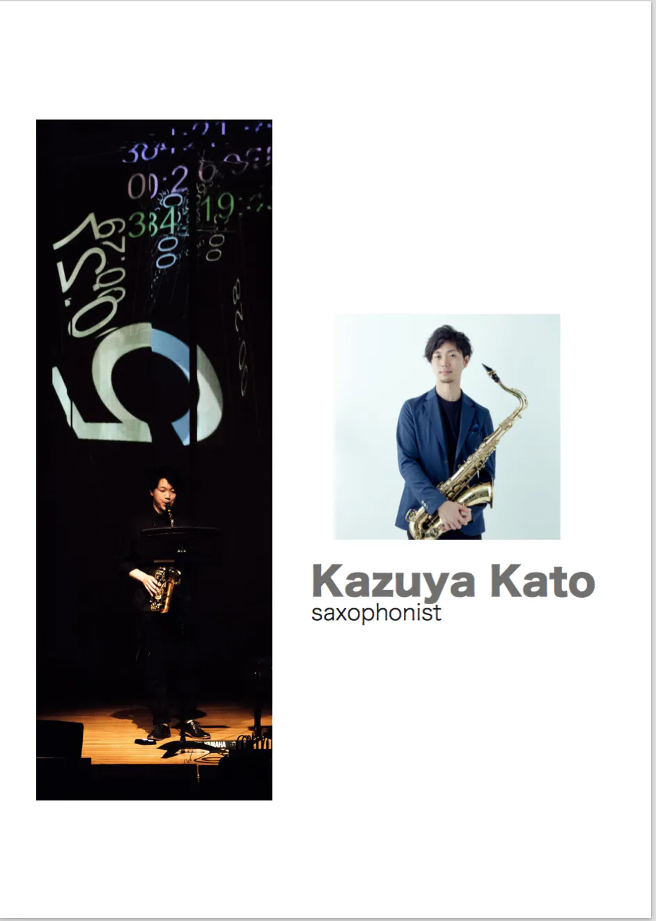 ▶︎加藤和也 広島市出身。デンマーク政府奨学金を授与され渡欧。デンマーク王立ユラン音楽院ソリストクラス修了。第2回ジャン=マリ ロンデックス国際サクソフォンコンペティションセミファイナリスト。ユランサクソフォンクァルテットのメンバーとしてデンマーク国内を中心に活動を行った他、これまでに、イギリス、スウェーデン、シンガポールにてコンサートを行う。デンマーク王立ユラン音楽院ティーチングアシスタントを務めた後、2012年に帰国。帰国後はSingapore Saxophone Symposium 2012での演奏、瀬戸内国際芸術祭2013 "サクソフォーンアイランド"ディレクター、瀬戸内国際芸術祭2016オープニングセレモニーでのソロ演奏、また、愛知県立芸術大学芸術講座にて講師を務めた。現在、Carrefour Saxophone Quartet メンバー、日本ウインドアンサンブル《桃太郎バンド》団員、エリザベト音楽大学付属音楽園非常勤講師。広島県立熊野高等学校普通科芸術類型音楽コース非常勤講師。