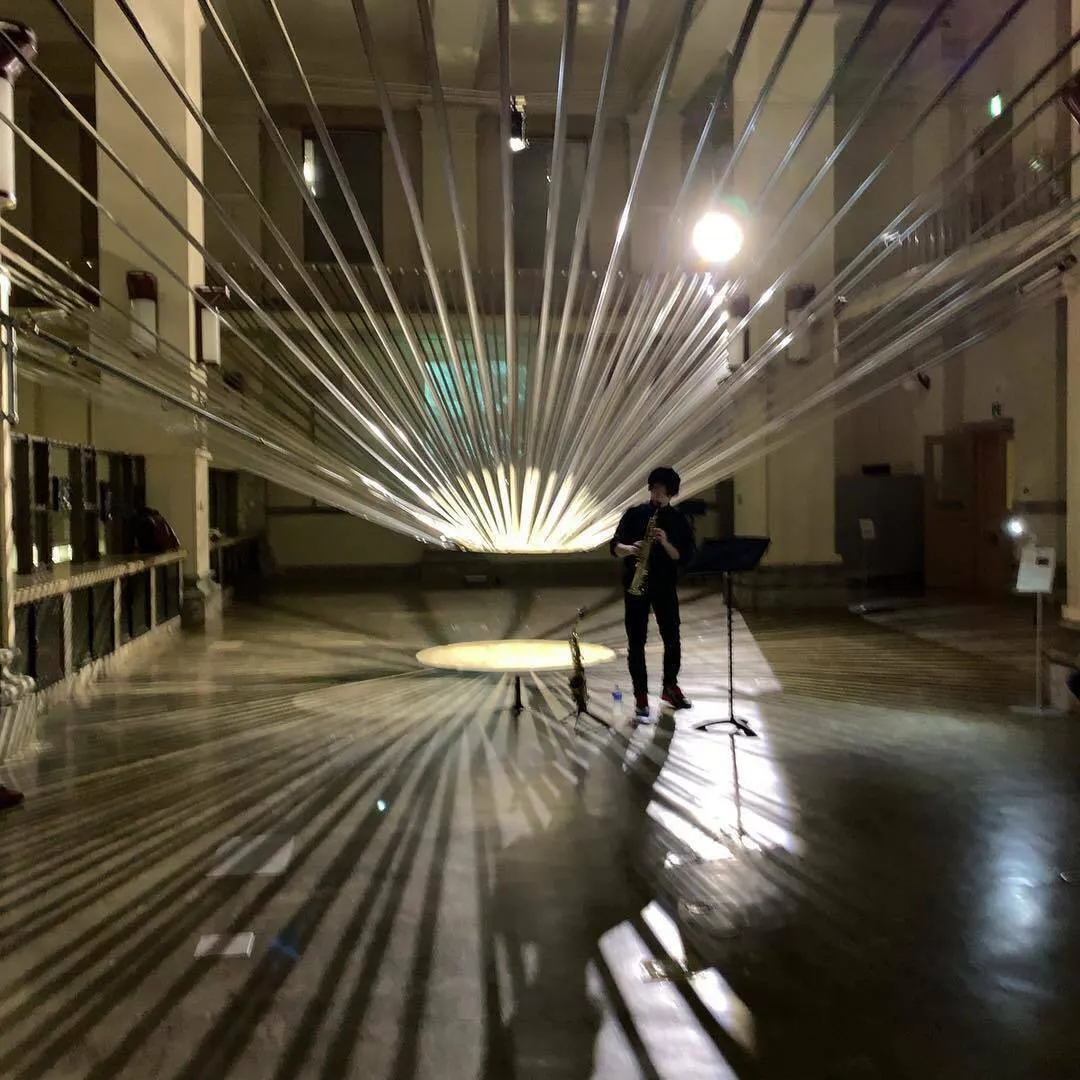旧日本銀行 広島支店 ゼロプロジェクトにて。2018年10月。アーティスト藤元明の作品とサックス奏者加藤和也のコラボレーションの様子。(このページのトップにある動画もその作品。ゼロプロジェクトPeter Bill 作)