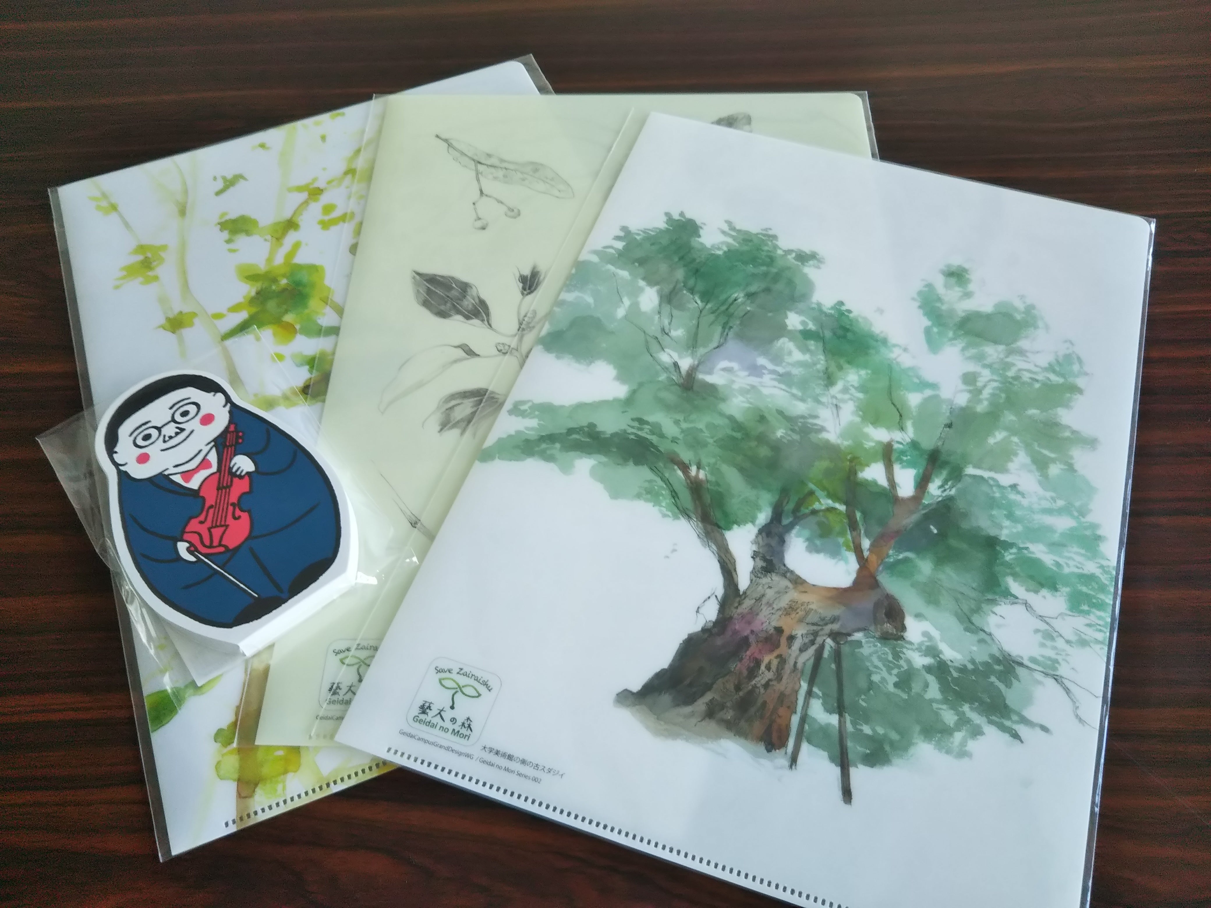 キャンパスに残る貴重な武蔵野の植生を守り育みながら良好なキャンパス環境を実現する取り組み「藝大の森」を応援するクリアファイル。絵はこの取組に参加する学生が描いたものです。