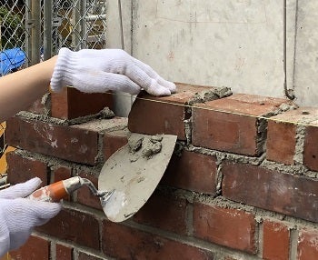 - 取り外したレンガをきれいにした後、新しい柱・塀の表面仕上げとして取り付ける-