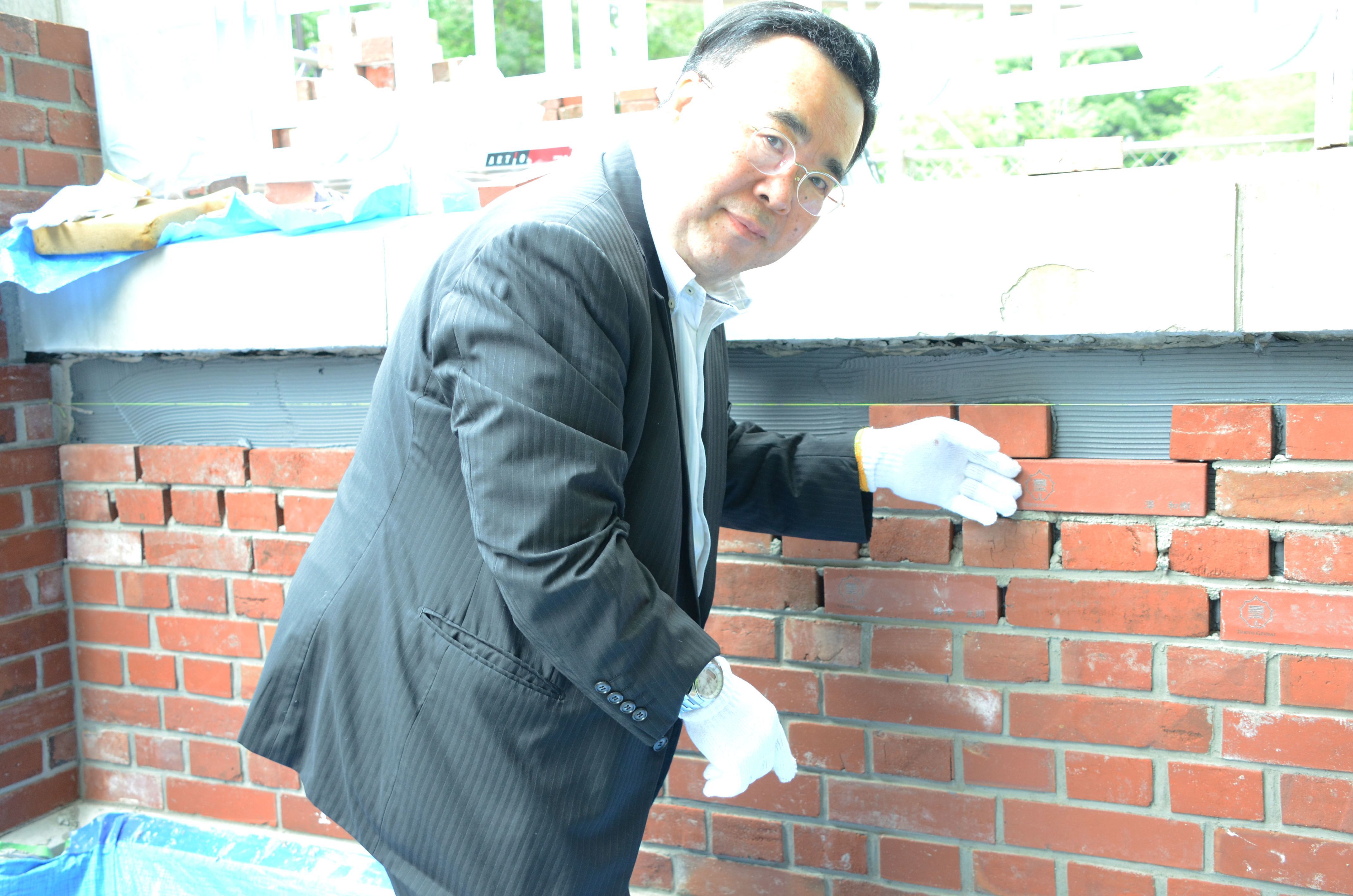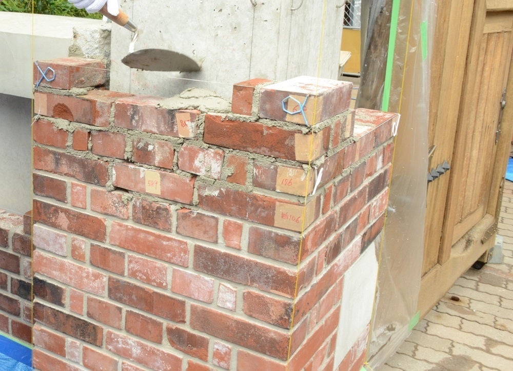 正門は新しく改築してしまうと、100年前からの歴史ある姿を受け継ぐことはできません。既存のレンガを取り外し洗浄した後、新しい柱・塀の表面仕上げとして取り付けることにより、姿を受け継ぐための再生をしています。