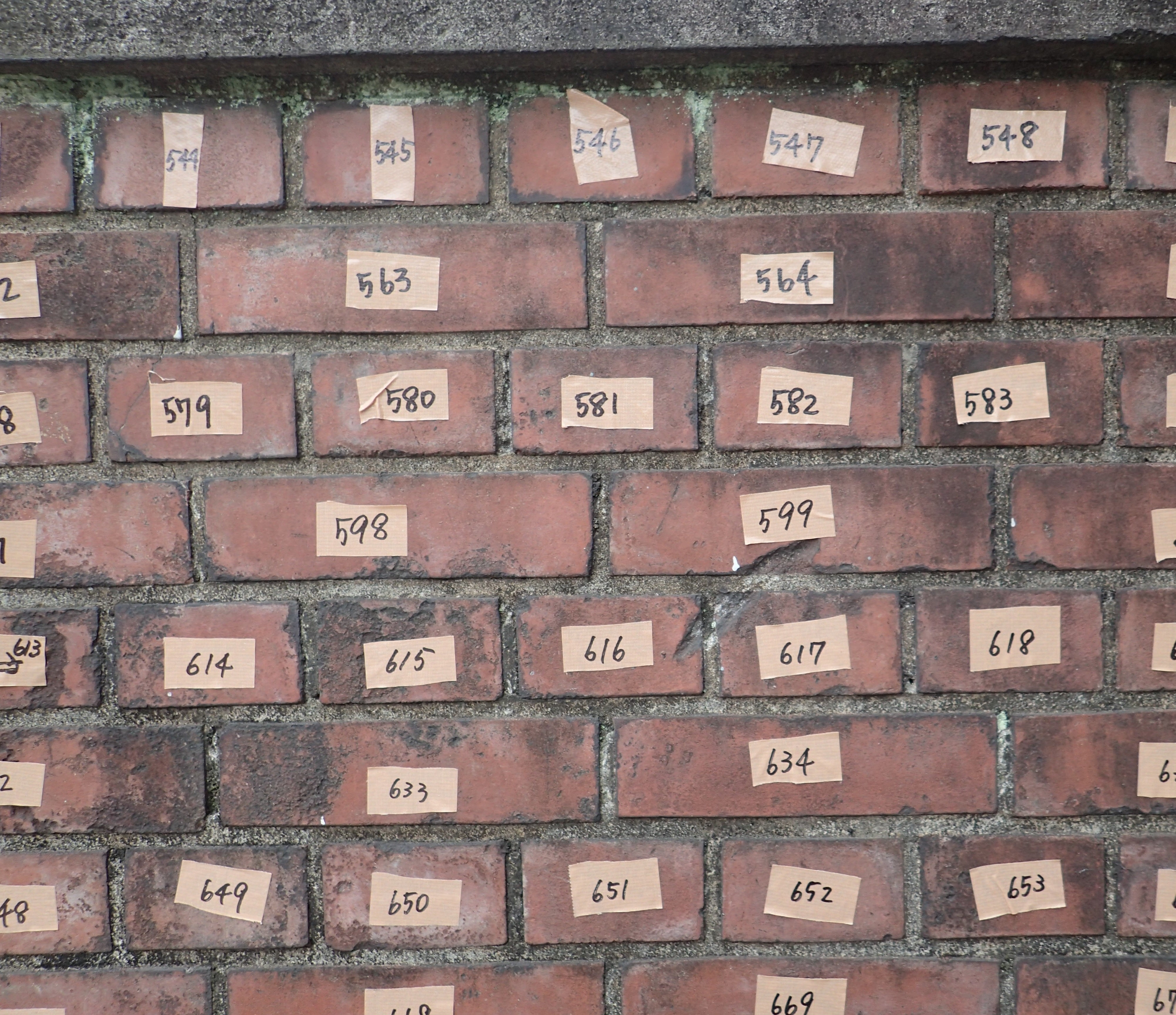 昨日より本格的に正門再生工事が始まりました。こちらは応急処置のフレームを取った姿です。この姿に戻せるようオール藝大で頑張っていきます。工事の状況を紹介致します。木製扉も再利用するため一旦取り外します。レンガ一つ一つに番号を付けました。一つ一つ手作業でレンガを外しています。