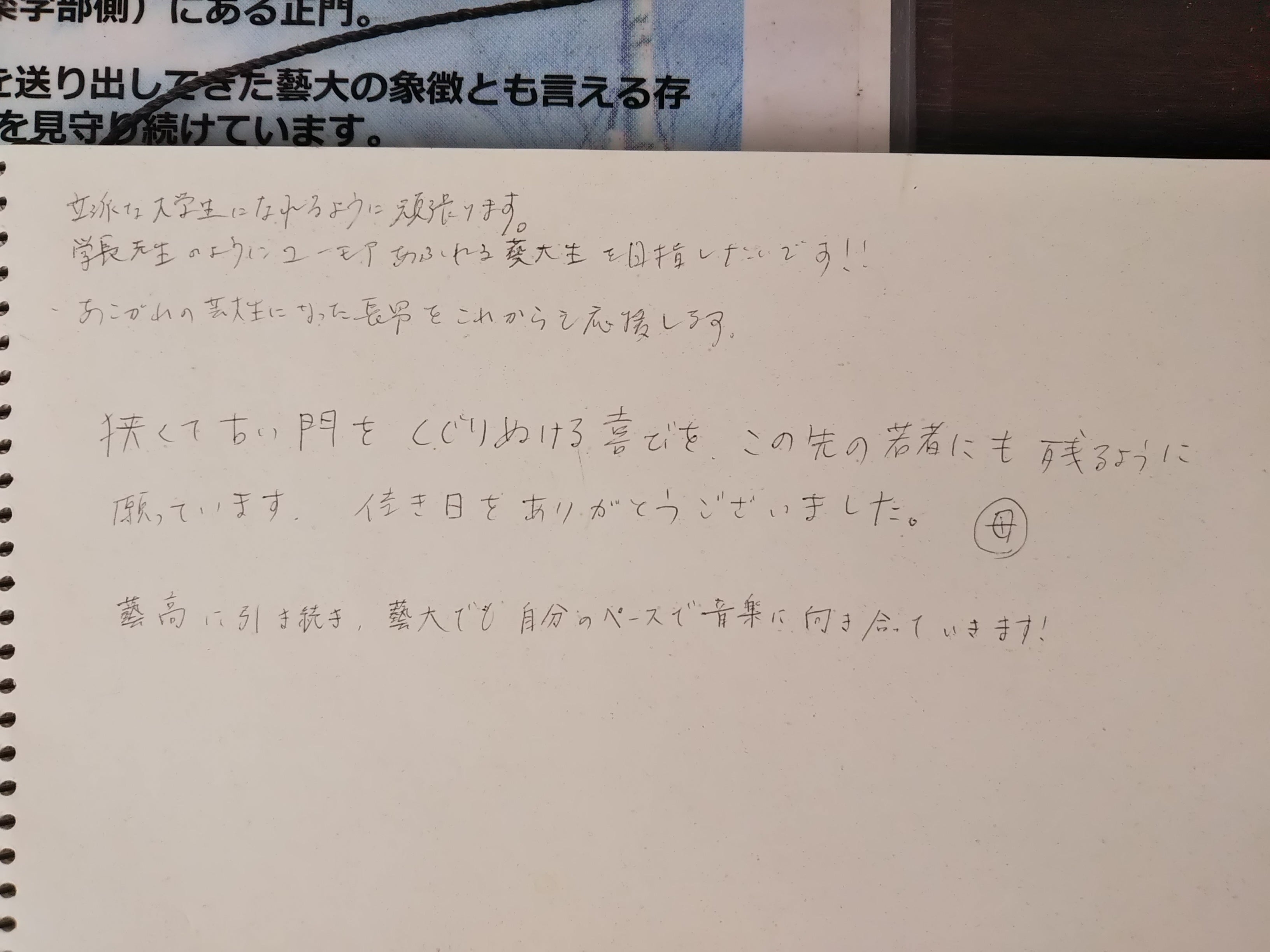 正門付近に置いている"寄せ書き"ノート。今日は、そのノートに寄せられた、みなさまからの想いをご紹介します。ほんとうに多くのメッセージをありがとうございました!なお、このノートは、クラウドファンディング終了日の6/9まで、正門入ってすぐの守衛所前に置いています。残りわずかですが、上野にお越しの際には、ぜひ一言記してください。(関連記事)みなさまから寄せられた想い~HAGISO展示での寄せ書きより~