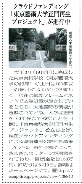 2019年5月21日付けの新美術新聞で東京藝術大学正門再生プロジェクトの記事を掲載していただきました。 3ページ中段のところに取り上げていただきました。お見かけした際は、是非ご覧ください。