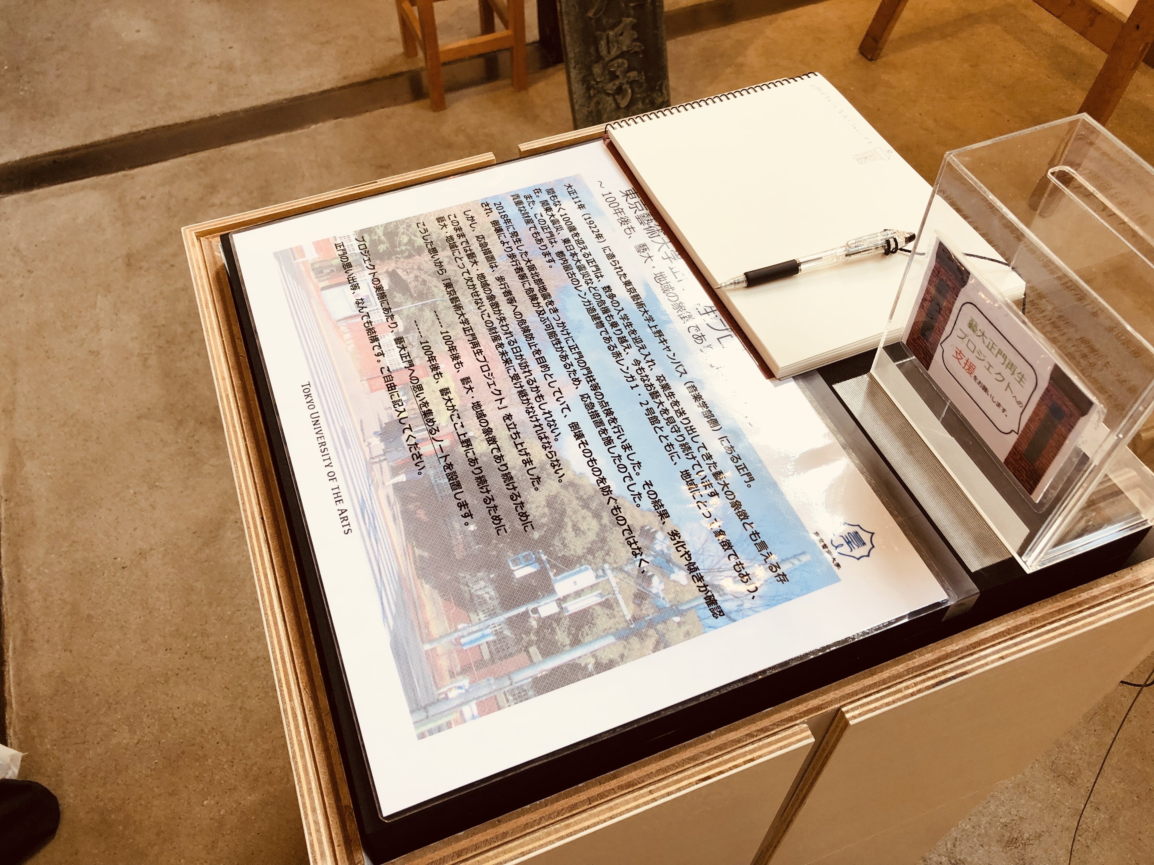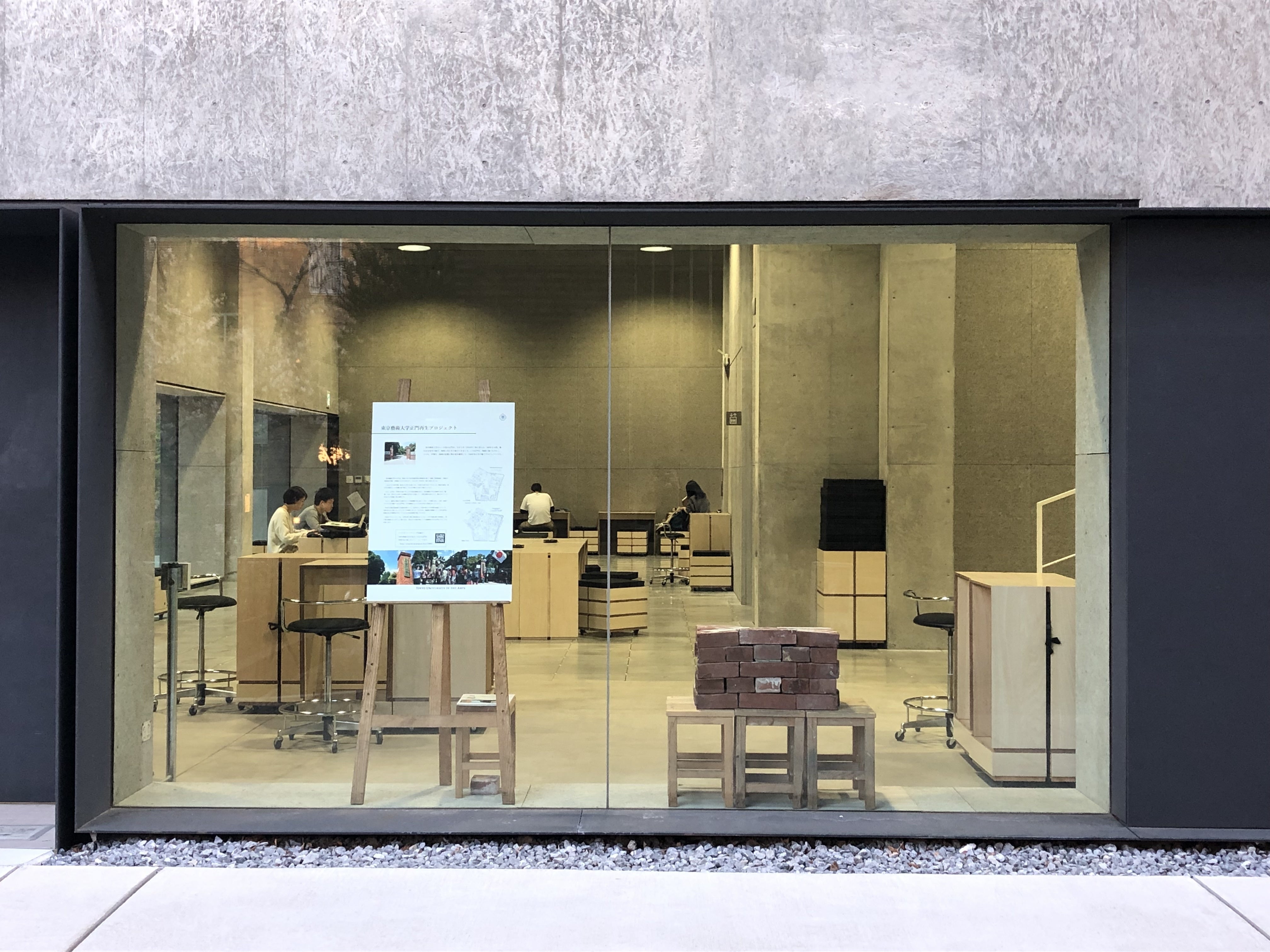 クラウドファンディングスタートから20日が経ちました。お陰様で、100万円超えが目前に迫ってきました。ご支援いただいたみなさま、ありがとうございます!そして、みなさまからの応援・ご支援を引き続きよろしくお願いいたします。さて、4/5までHAGISOにて開催していた関連展示が、本学の上野キャンパスでもご覧いただけるようになりました。場所は、昨年全館オープンした国際藝術リソースセンターのB棟1階です。今回は、建物外部よりご覧いただけます。全景(先に進むとアートプラザ、大学美術館へ)国際藝術リソースセンターB棟1階は、新設されたラーニングコモンズ赤い矢印の2か所の門は、アートプラザ閉店時には開いていませんので、ご注意ください。サクラの季節は終わりを迎えつつありますが、上野・谷根千界隈にお越しの際にお立ち寄りください。なお、現在、大学美術館では「藝大コレクション展2019」も開催されています。併せてご覧ください。設営した4/6はサクラが満開でした