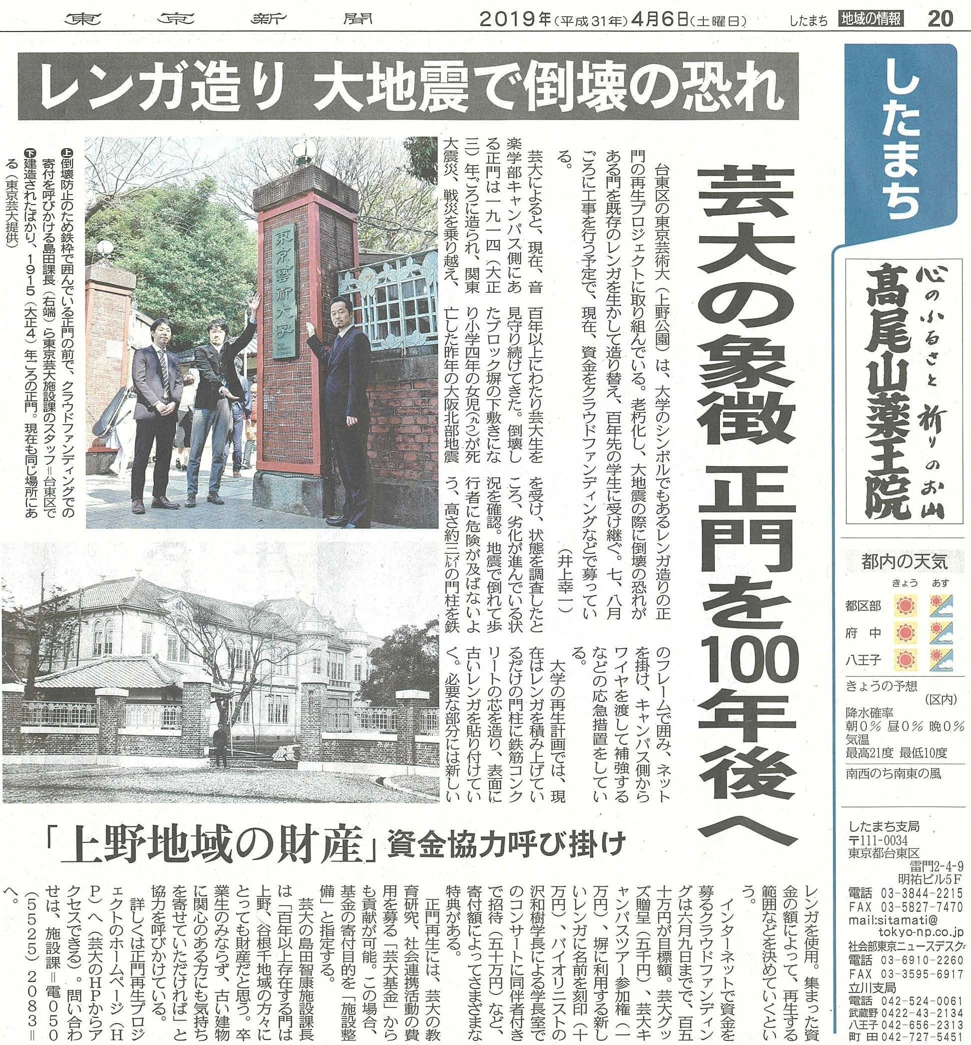4/6(土)の東京新聞朝刊で、正門再生プロジェクトのことをご紹介いただきました!あわせて東京新聞のwebサイトでも記事配信されております。→こちらぜひご一読ください。そして、みなさまからの更なるご支援お待ちしております。さて、今日は入学式です。見事なまでの晴天、さらに桜の花びらが舞う中、これから新入生が正門をくぐって会場の奏楽堂に向かいます。入学式の模様は、また後ほど。