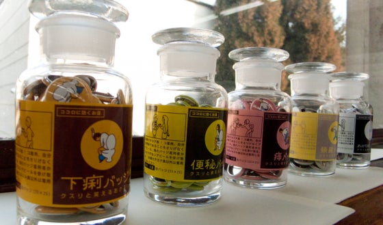 写真は「刺すおクスリ」こと、病気缶バッジです。