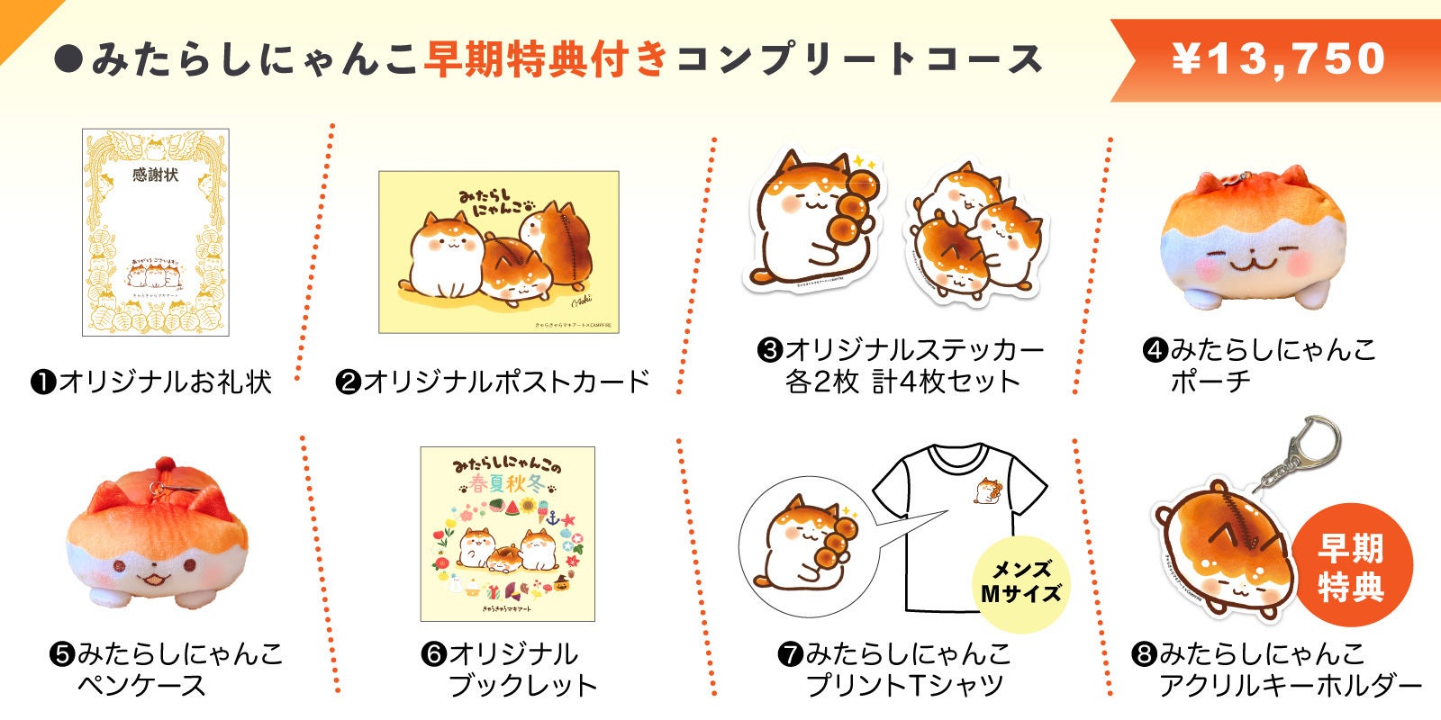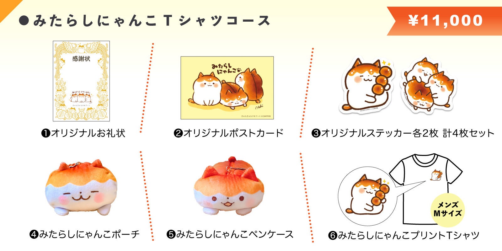 ファン必見のコースです。本プロジェクト限定の「みたらしにゃんこプリントTシャツ」とみたらしにゃんこポーチ&ペンケースコースと同様の内容をお届けいたします。