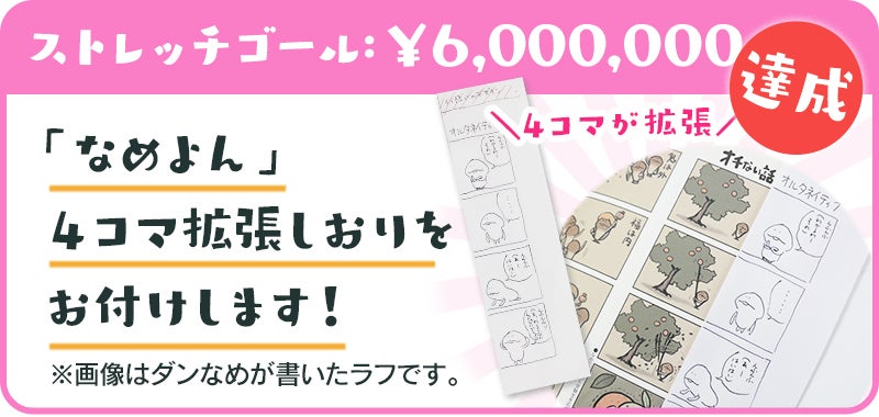 つきましては[ストレッチゴール600万円]のお約束である「4コマ拡張しおり」を全てのリターンに追加させていただきます。「なめよんが3倍楽しくなる」スペシャルなしおりをどうぞお楽しみに!!支援1口につきしおり1枚がリターンに追加されます。