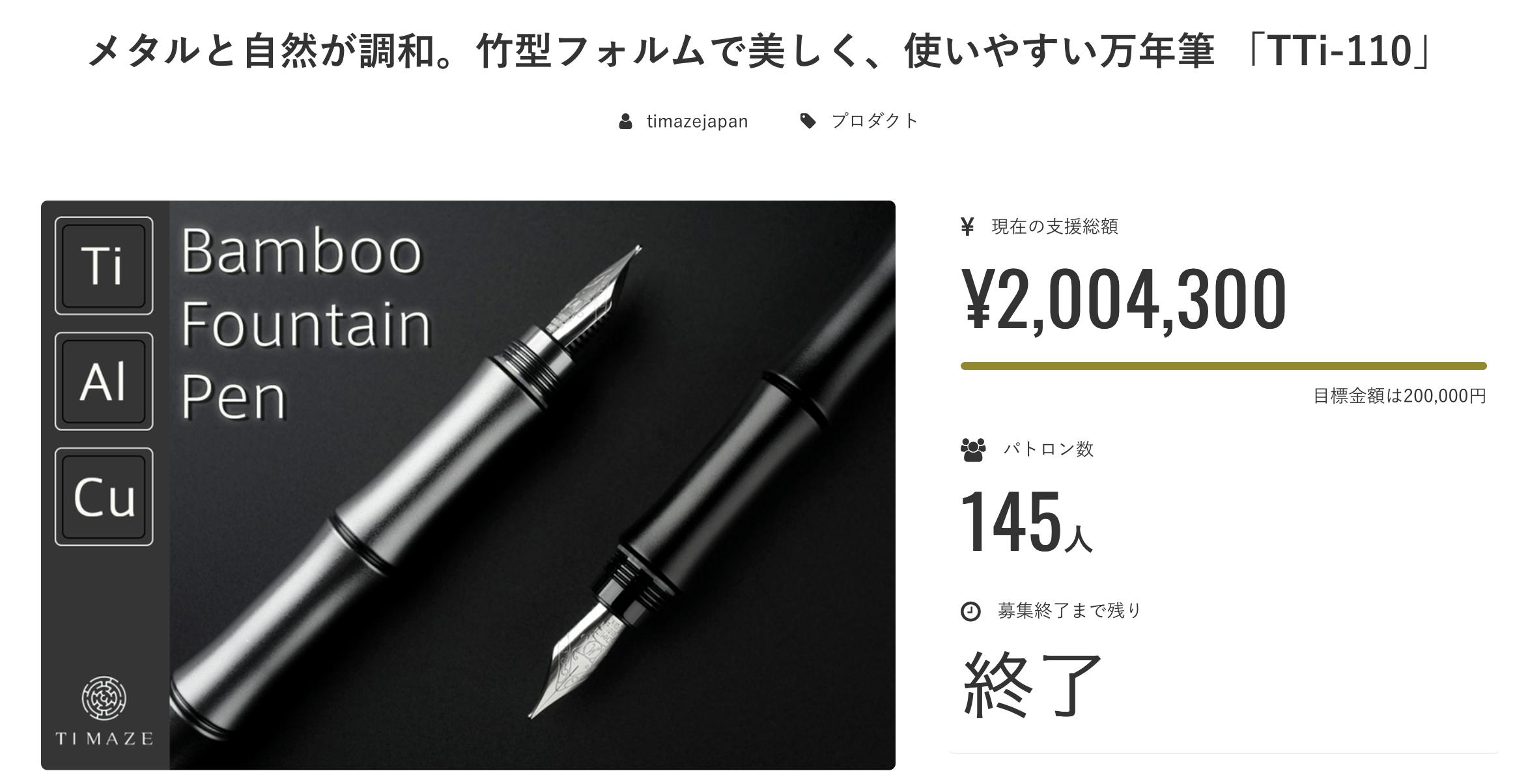 我々は香港のTI MAZE(タイメイズ)です。チタン製プロダクトを中心に開発、デザインから製造まで行なっています。直近ではmachi-yaにて竹型フォルムの万年筆「TTi-110」を初めてのキャンペーンとしてファンディングを実施し、皆さまにご支援いただきました。