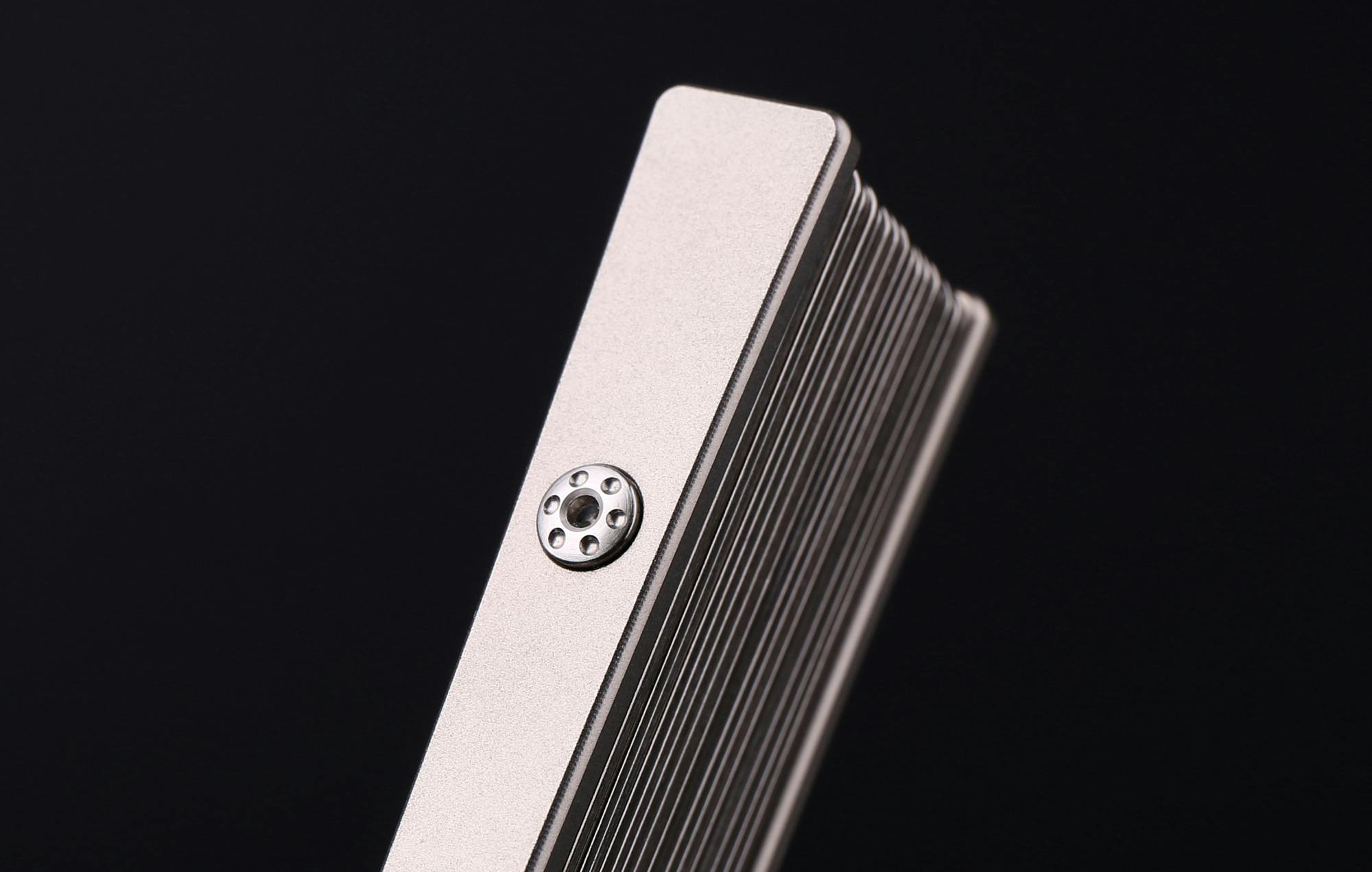 TTi-918はグレード5のチタンより鋳造した扇子で、強度・耐食性などが特徴。扇子の枠組みだけでなく、要の部分など細かいパーツにも惜しみなくチタン素材を投入することで、質感高く、高級感のあるプレミアムな製品に仕上げています。