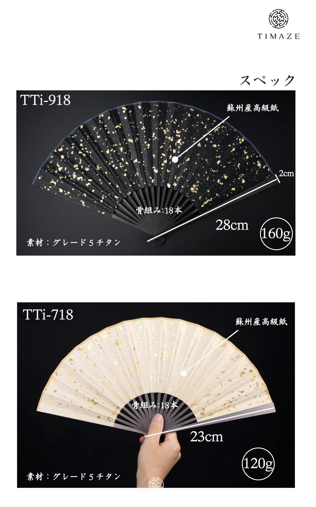 「TTi-718」は日本で一般的な扇子のサイズ感。一方、「TTi-918」は中国扇子のような大判のサイズ感。それ以外の違いはほとんどありませんが、小さい方が「TTi-718」、大きい方が「TTi-918」です。