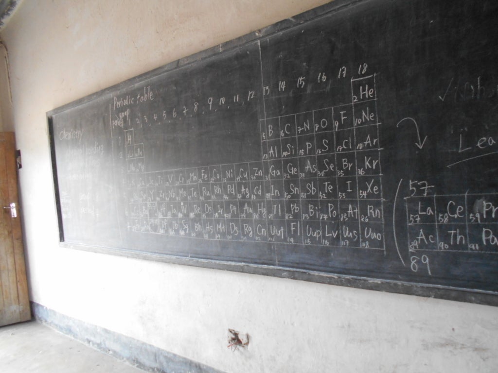 周期表も教室に貼っておくと、盗まれるので貼ることができません。こうやって、私が板書して生徒がノートに書き写していきます。