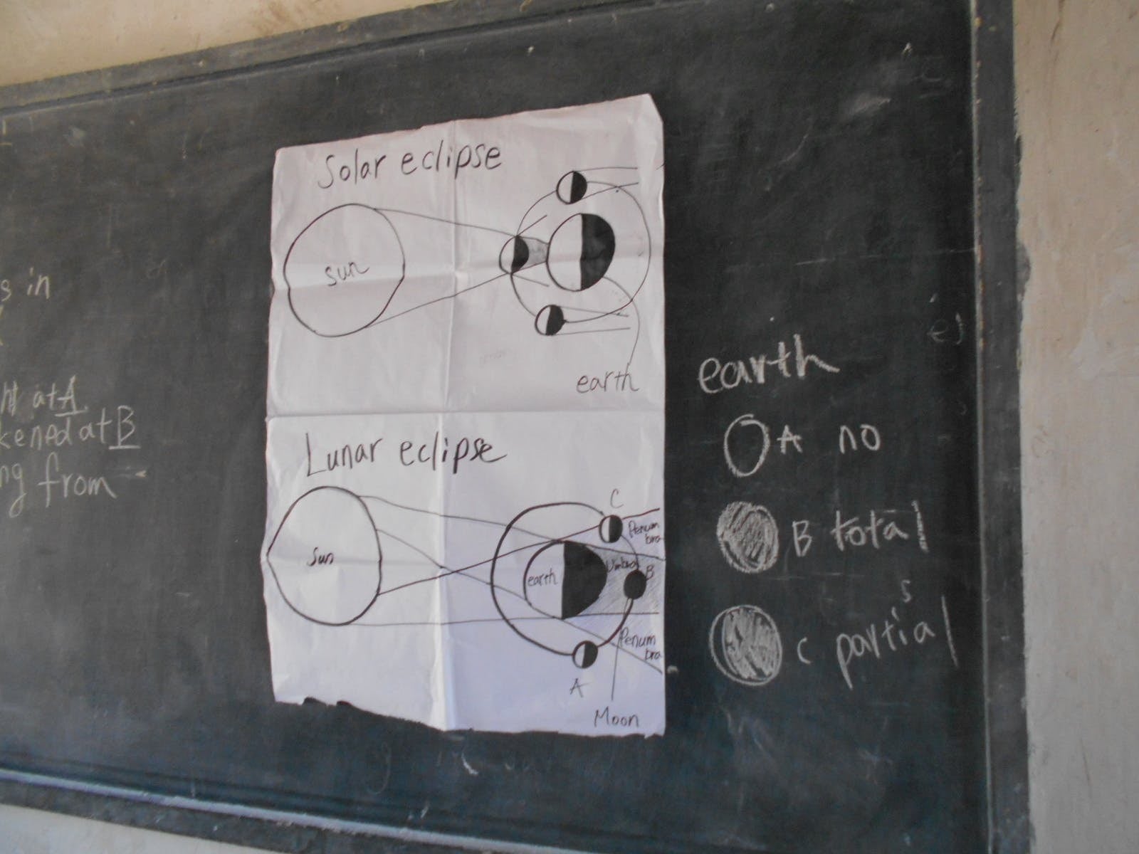 私のパソコンを使って、日食・月食の動画を生徒たちに見せたりもしました。パソコンを置くような台もないので、バケツの上に置きました。