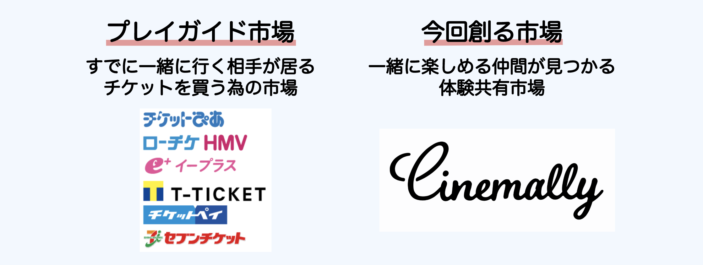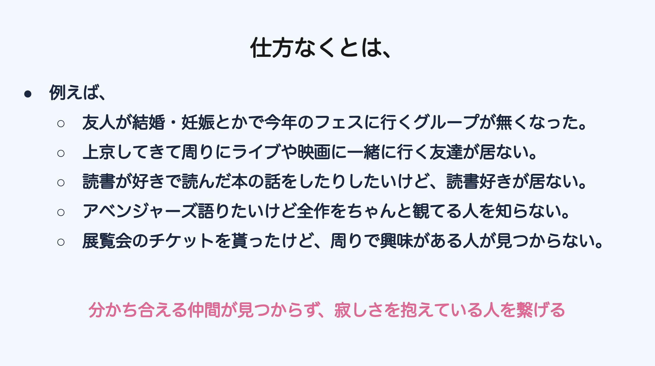 今回僕たちが作りたいサービスは、すでに行く人が決まっていてチケットを買おうとするサービスではなく、興味はあるけど一緒に行く人がいない・いつもは一人だけど本当はたまには誰かと行きたいを達成する、未だ無いサービスです。