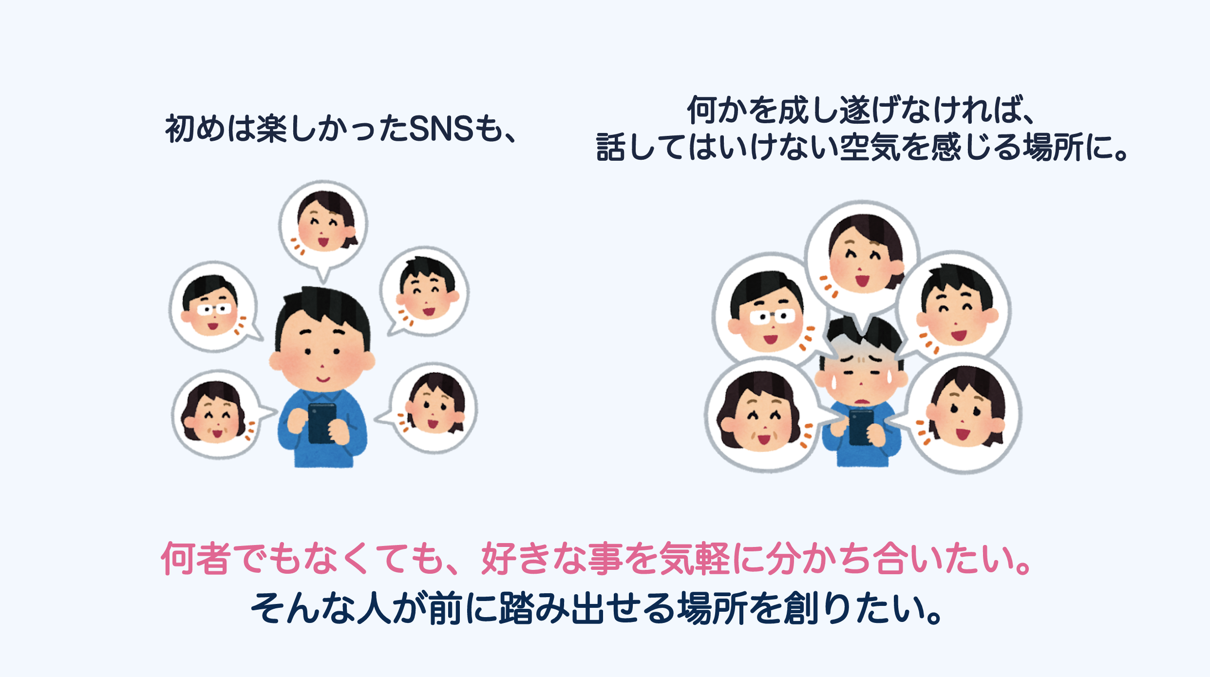 そんな孤独を抱える人が増える中でも自分の好きを気軽に分かち合える場所を創りたいと思っています。