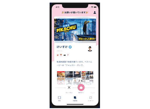 毎日ピックアップされるので、スワイプして誘うか待てば気が合う人と繋がります。