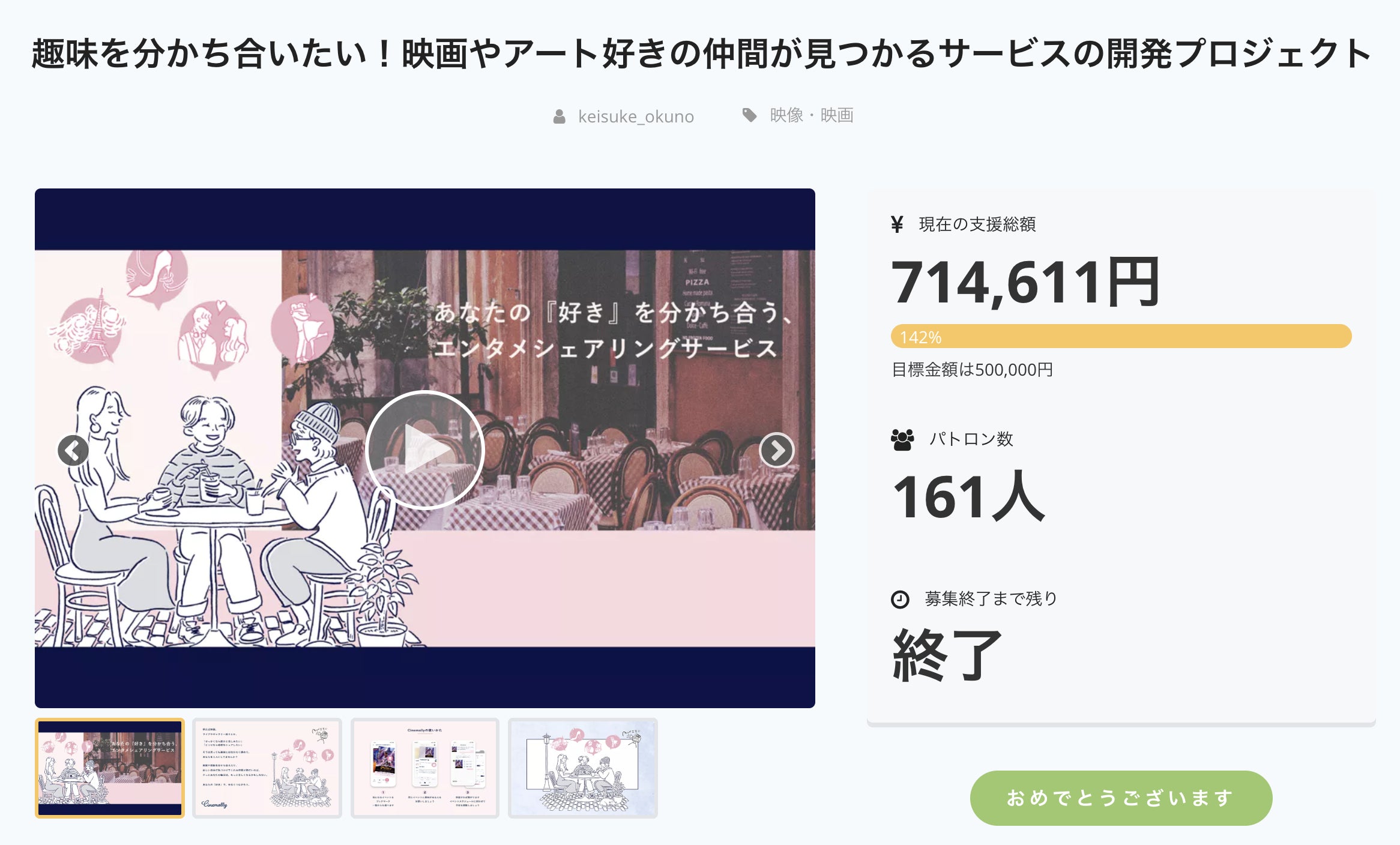 好きを分かち合うエンタメシェアリングサービス Cinemally を立ち上げたいと思い、CAMPFIREに掲載させていただきました。